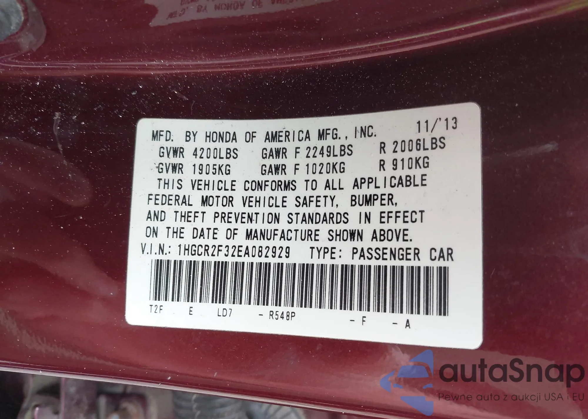 LOT: 42285773 VIN: 1HGCR2F32EA082929