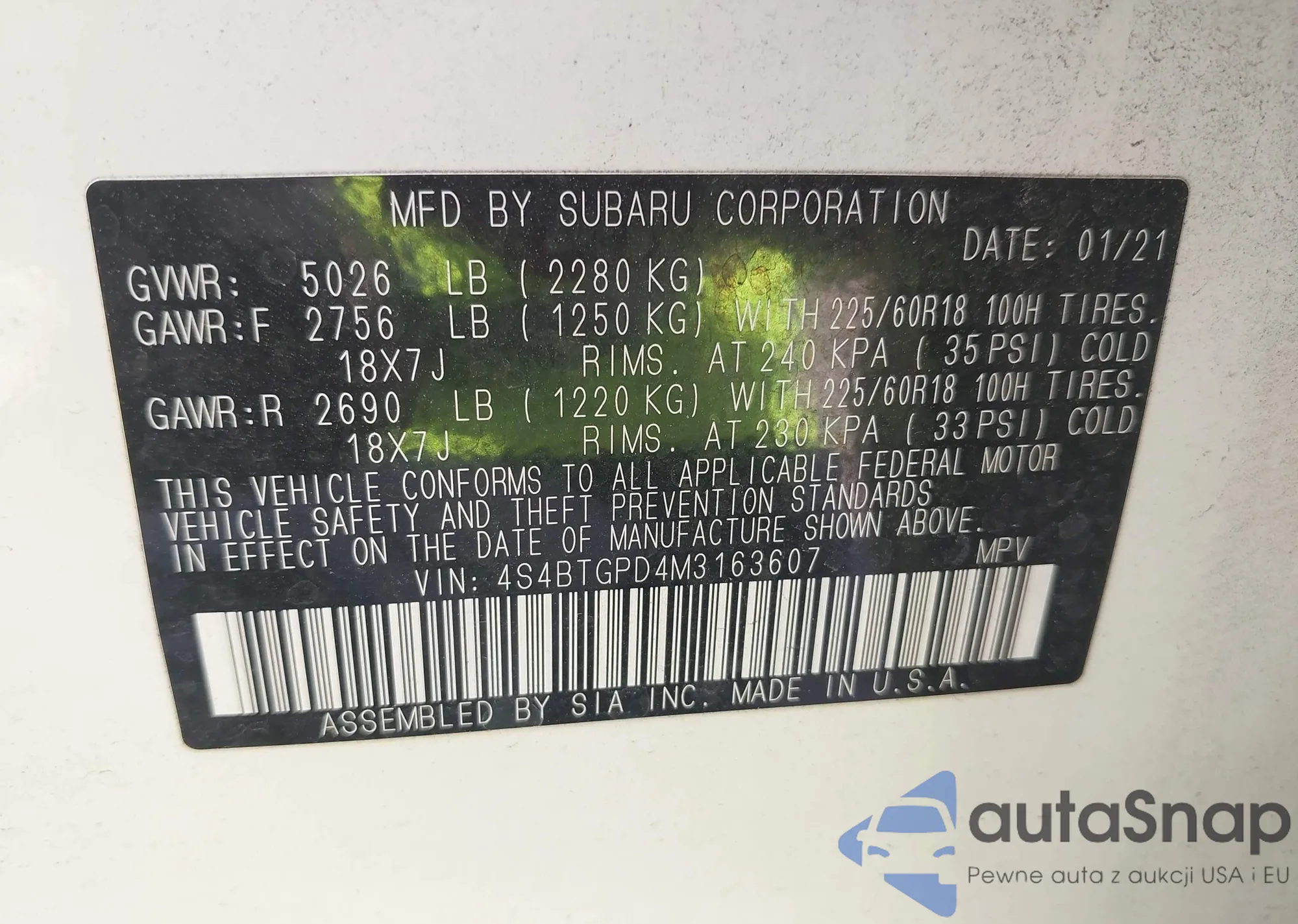LOT: 42481217 VIN: 4S4BTGPD4M3163607
