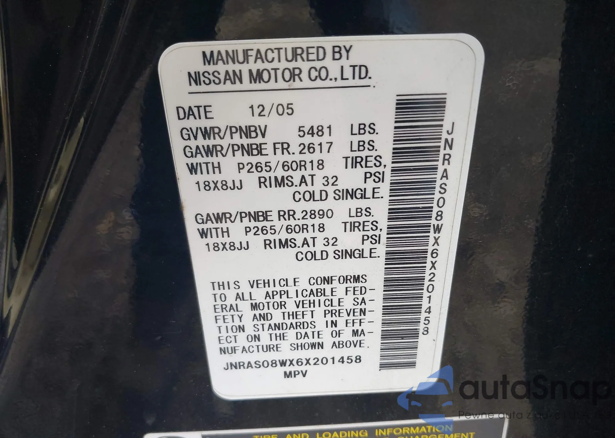 LOT: 42680448 VIN: JNRAS08WX6X201458