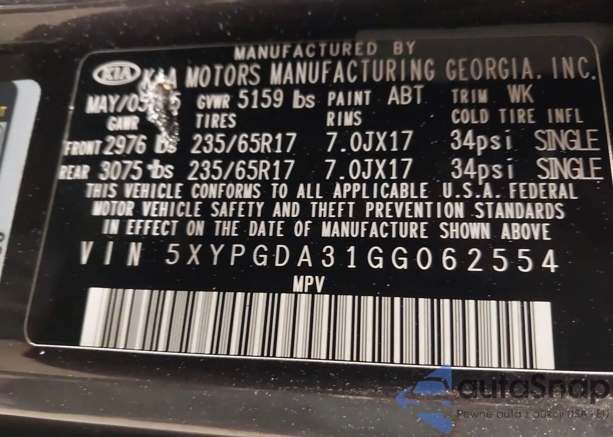 • VIN 5XYPGDA31GG062554