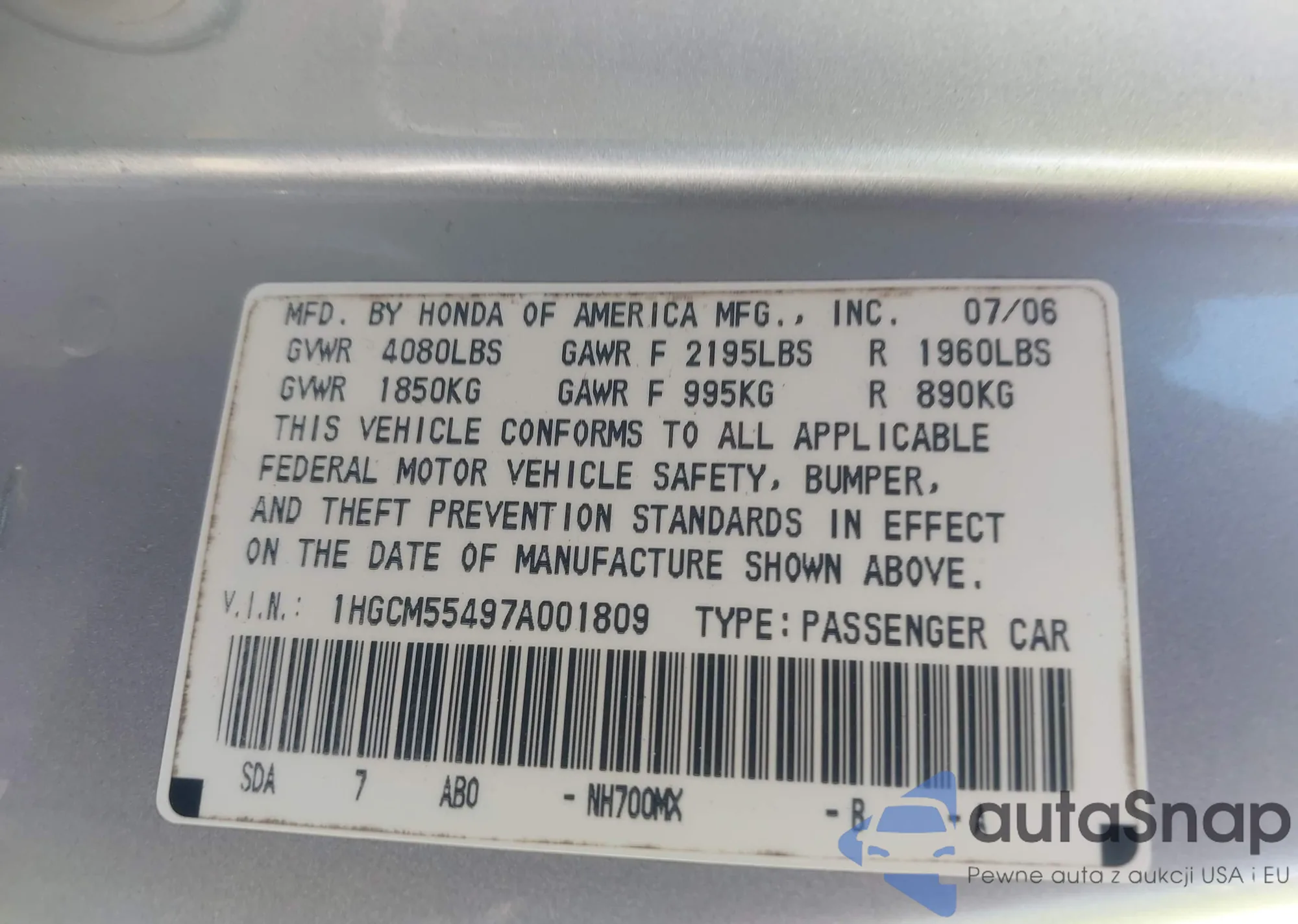 LOT: 42578247 VIN: 1HGCM55497A001809