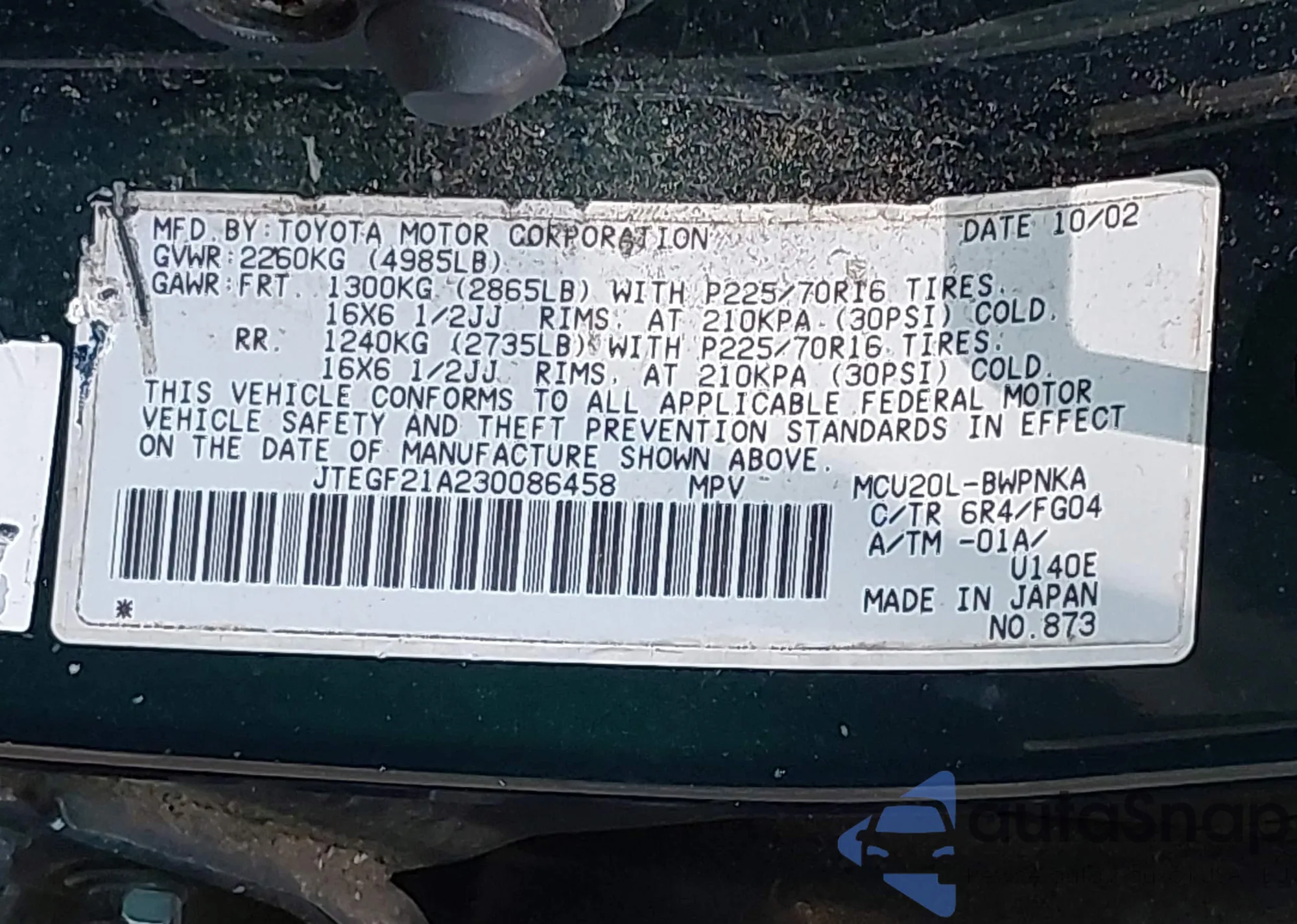 LOT: 42580628 VIN: JTEGF21A230086458