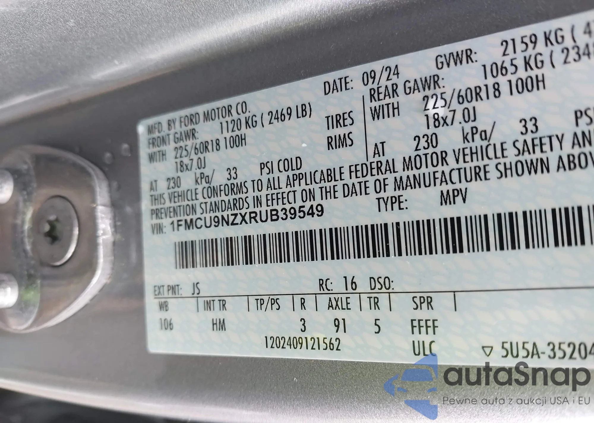 • VIN 1FMCU9NZXRUB39549