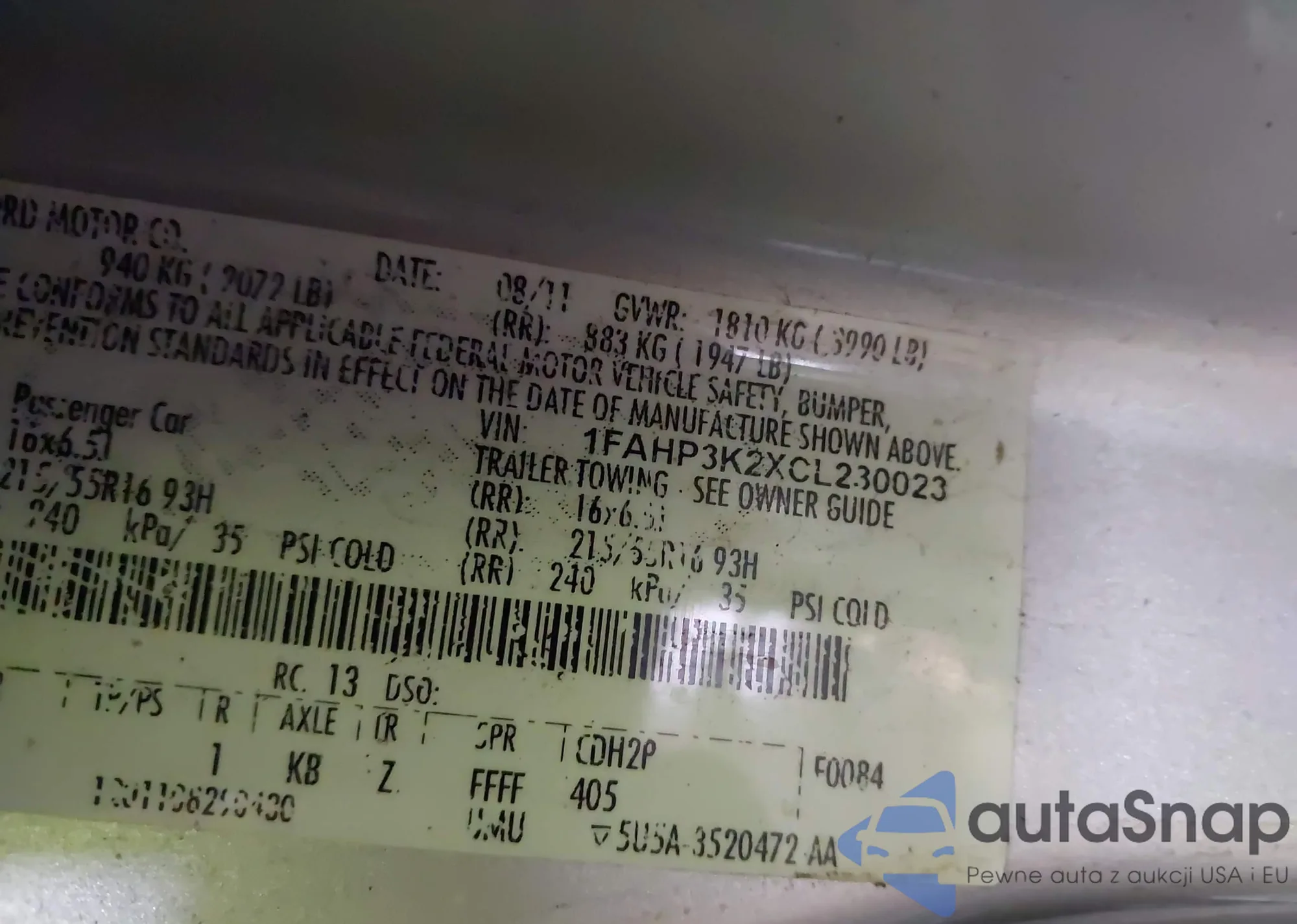 LOT: 42679424 VIN: 1FAHP3H27CL168278