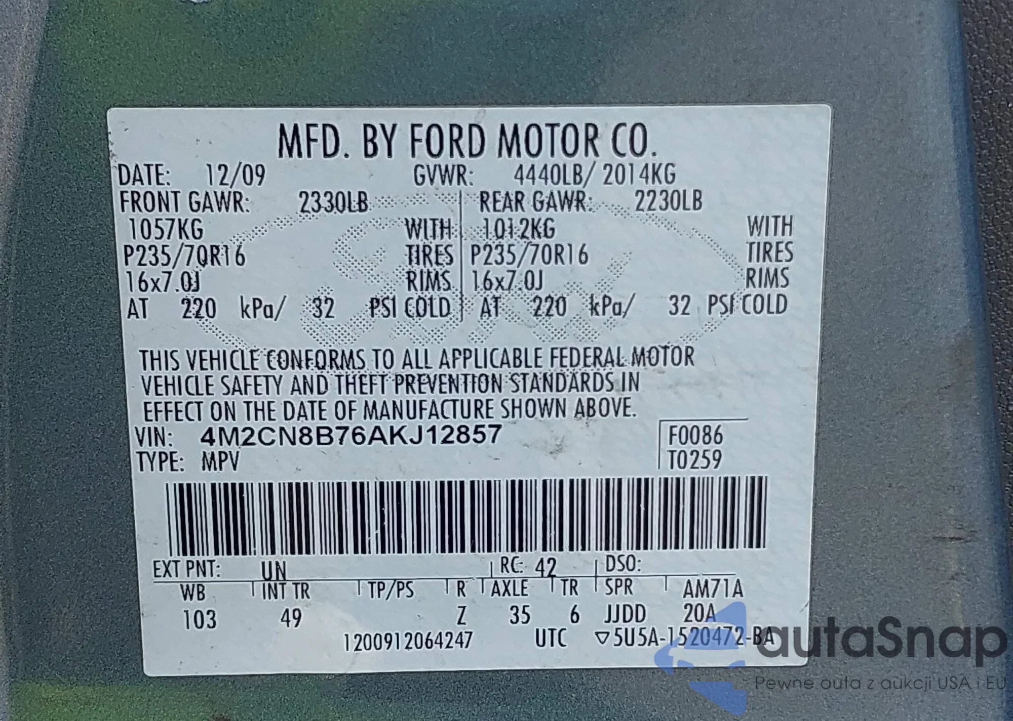 2010 Mercury Mariner z USA, uszkodzony, nr VIN 4M2CN8B76AKJ12857