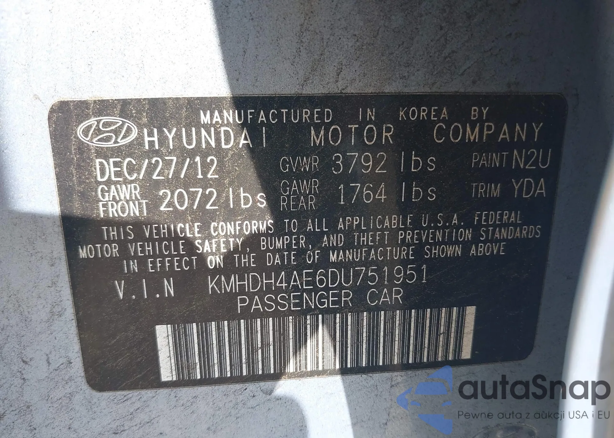 LOT: 42692852 VIN: KMHDH4AE6DU751951