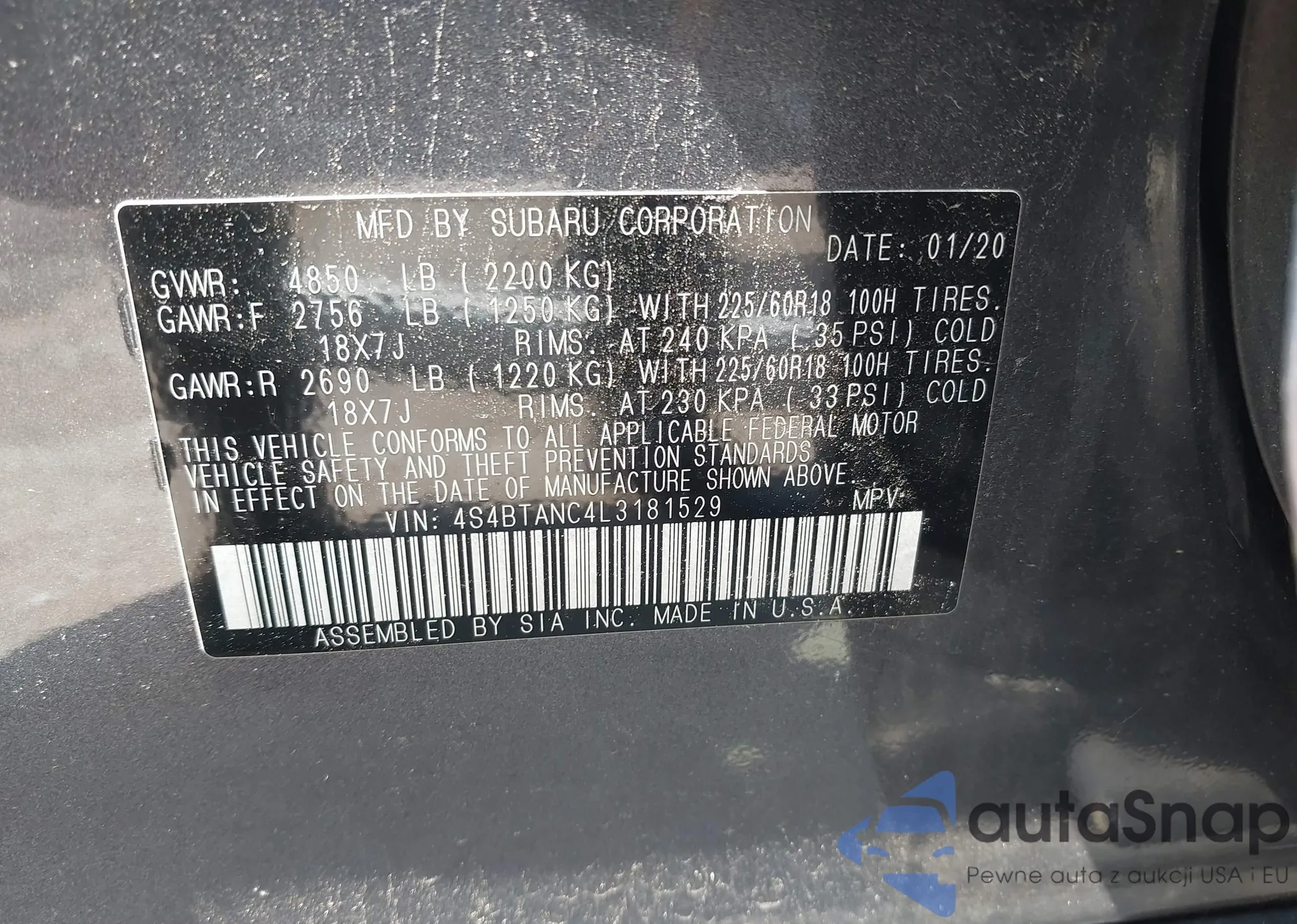 LOT: 42417410 VIN: 4S4BTANC4L3181529