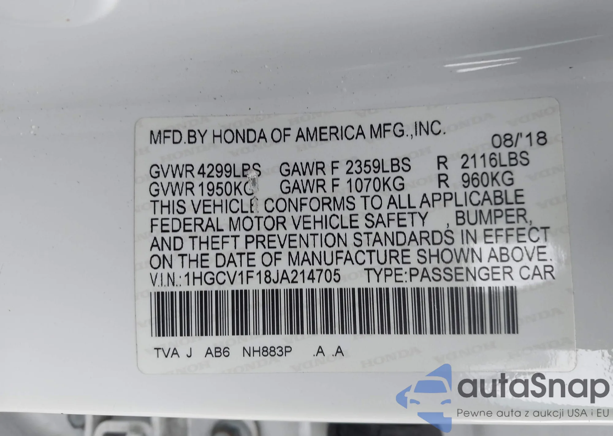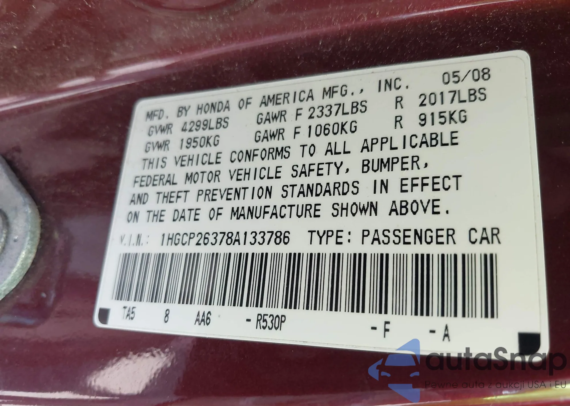 LOT: 42636109 VIN: 1HGCP26378A133786