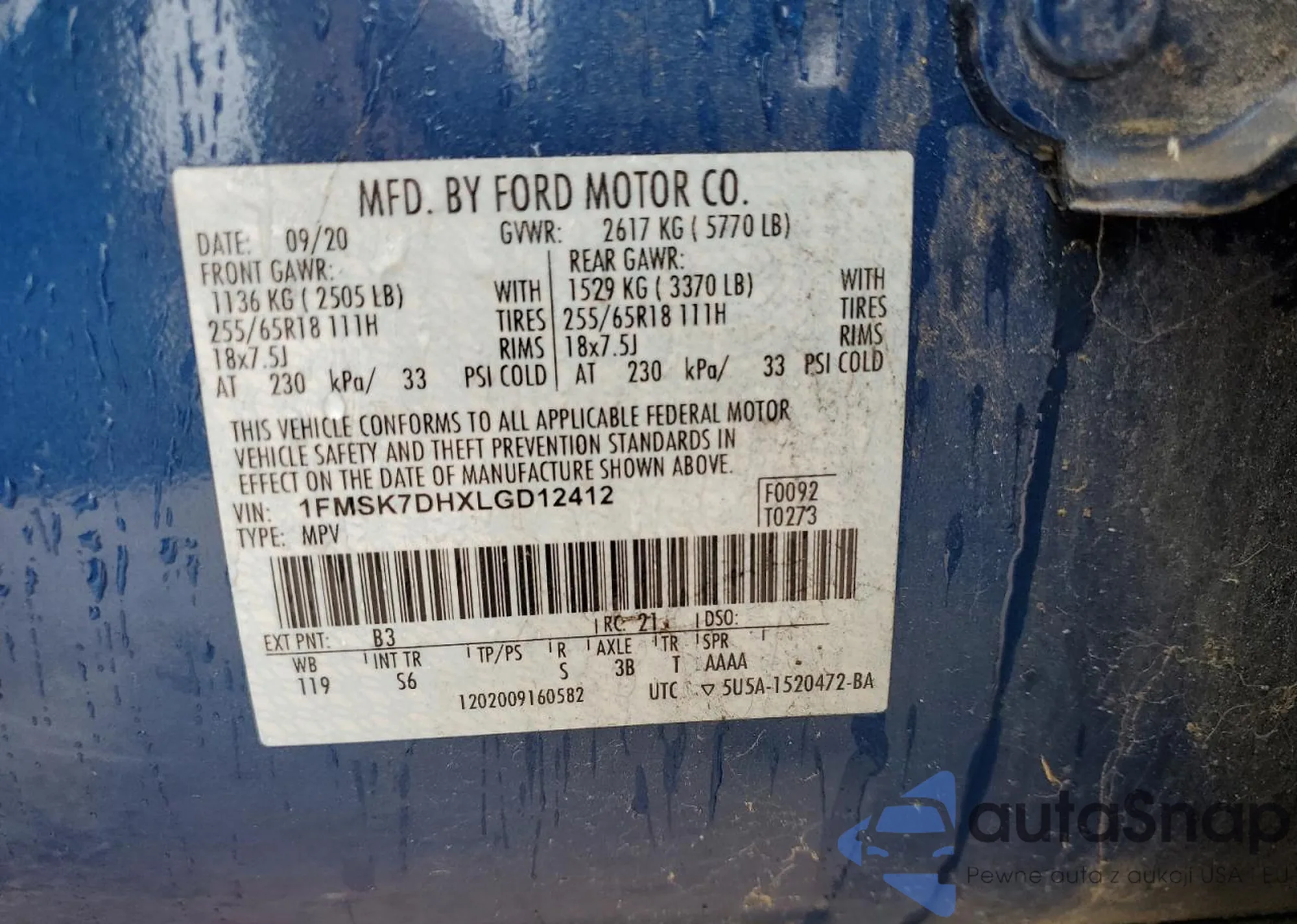 LOT: 58366355 VIN: 1FMSK7DHXLGD12412