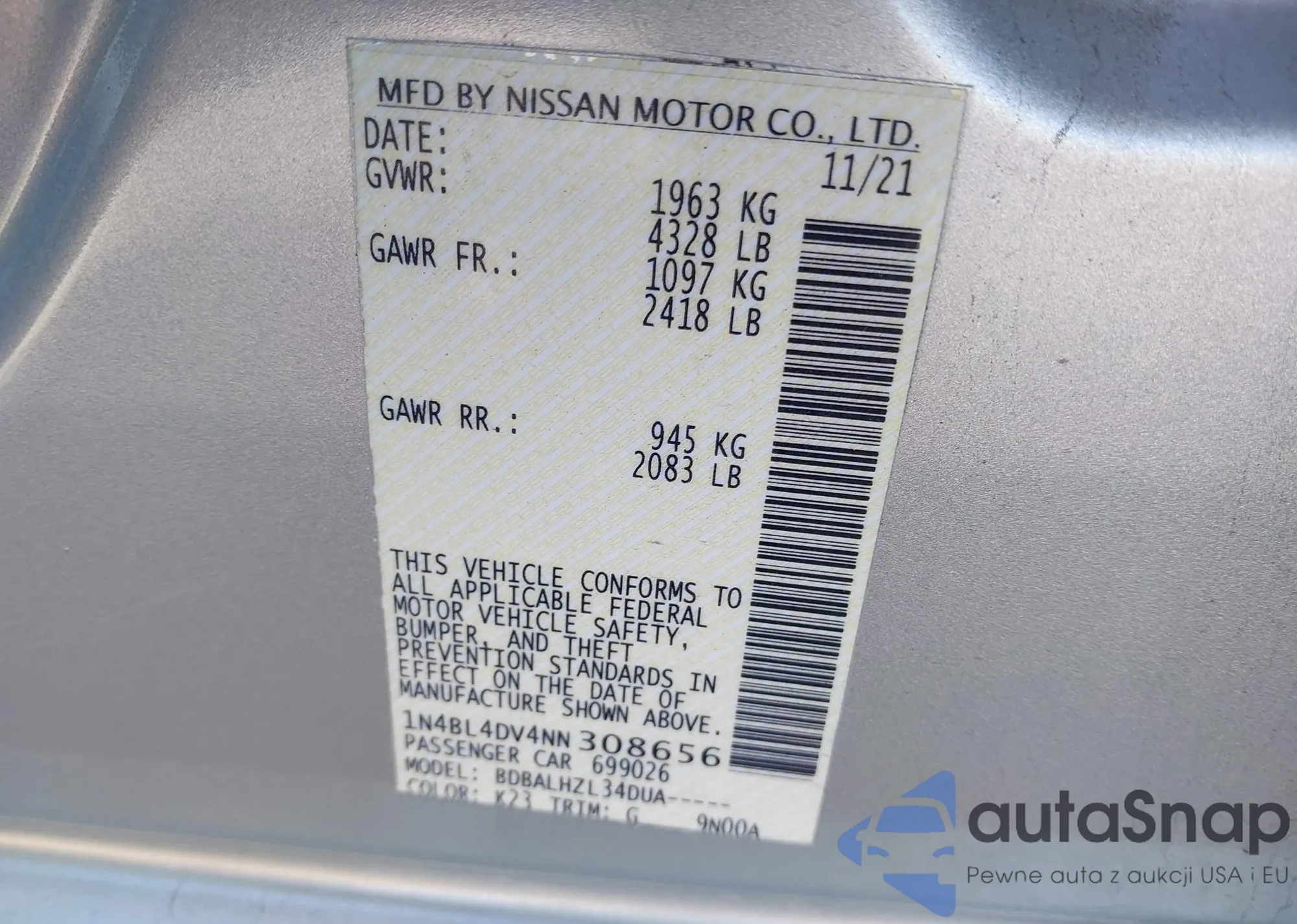 • VIN 1N4BL4DV4NN308656