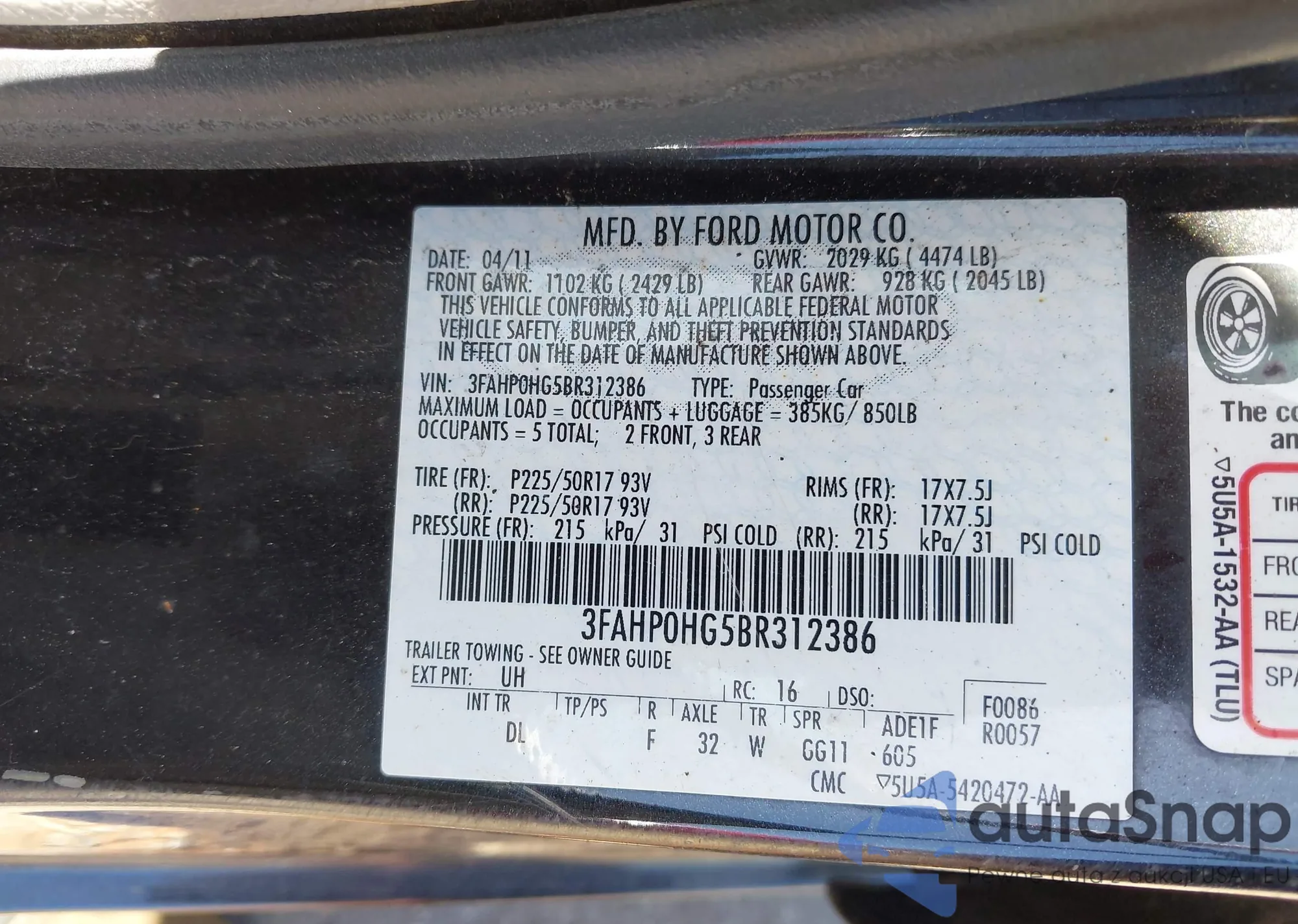 • VIN 3FAHP0HG5BR312386