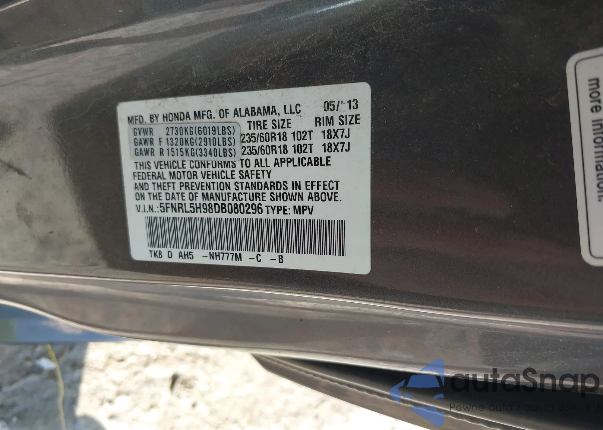 • VIN 5FNRL5H98DB080296