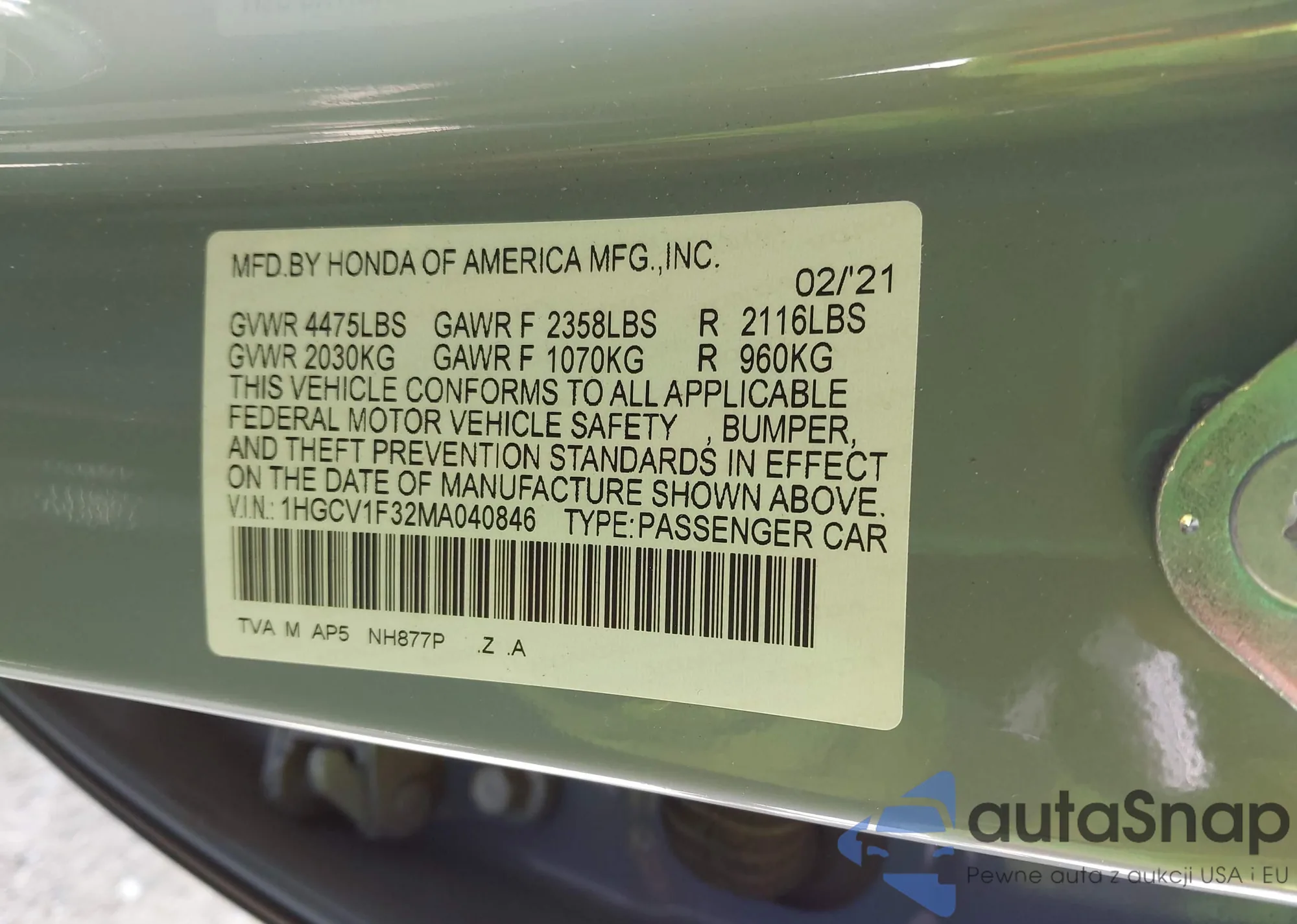 LOT: 42528345 VIN: 1HGCV1F32MA040846