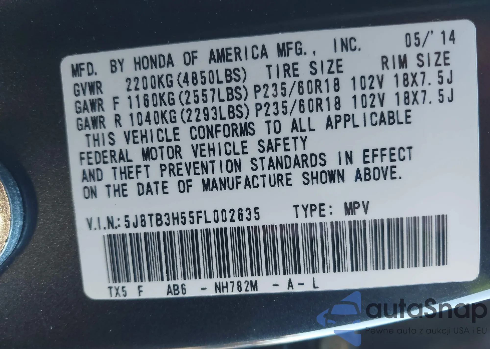 • VIN 5J8TB3H55FL002635