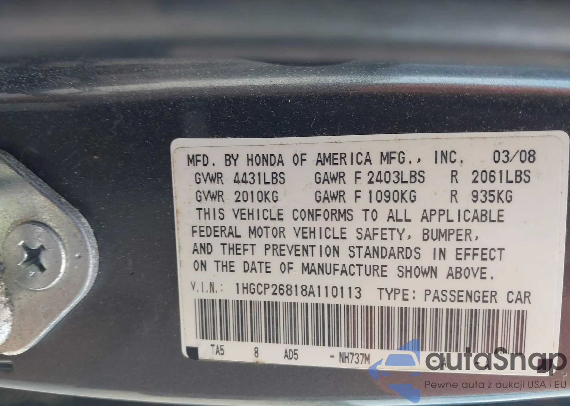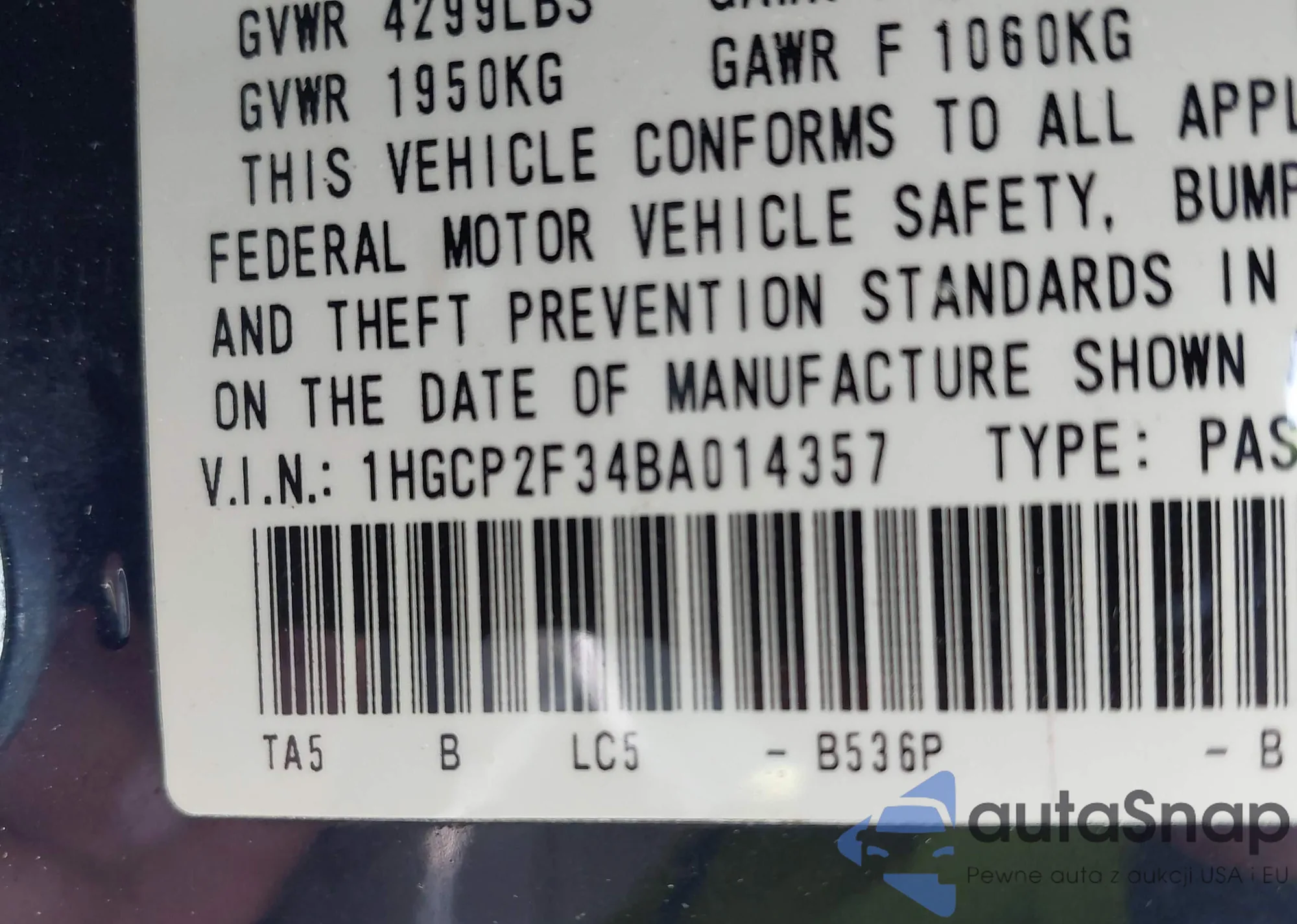 LOT: 42600975 VIN: 1HGCP2F34BA014357
