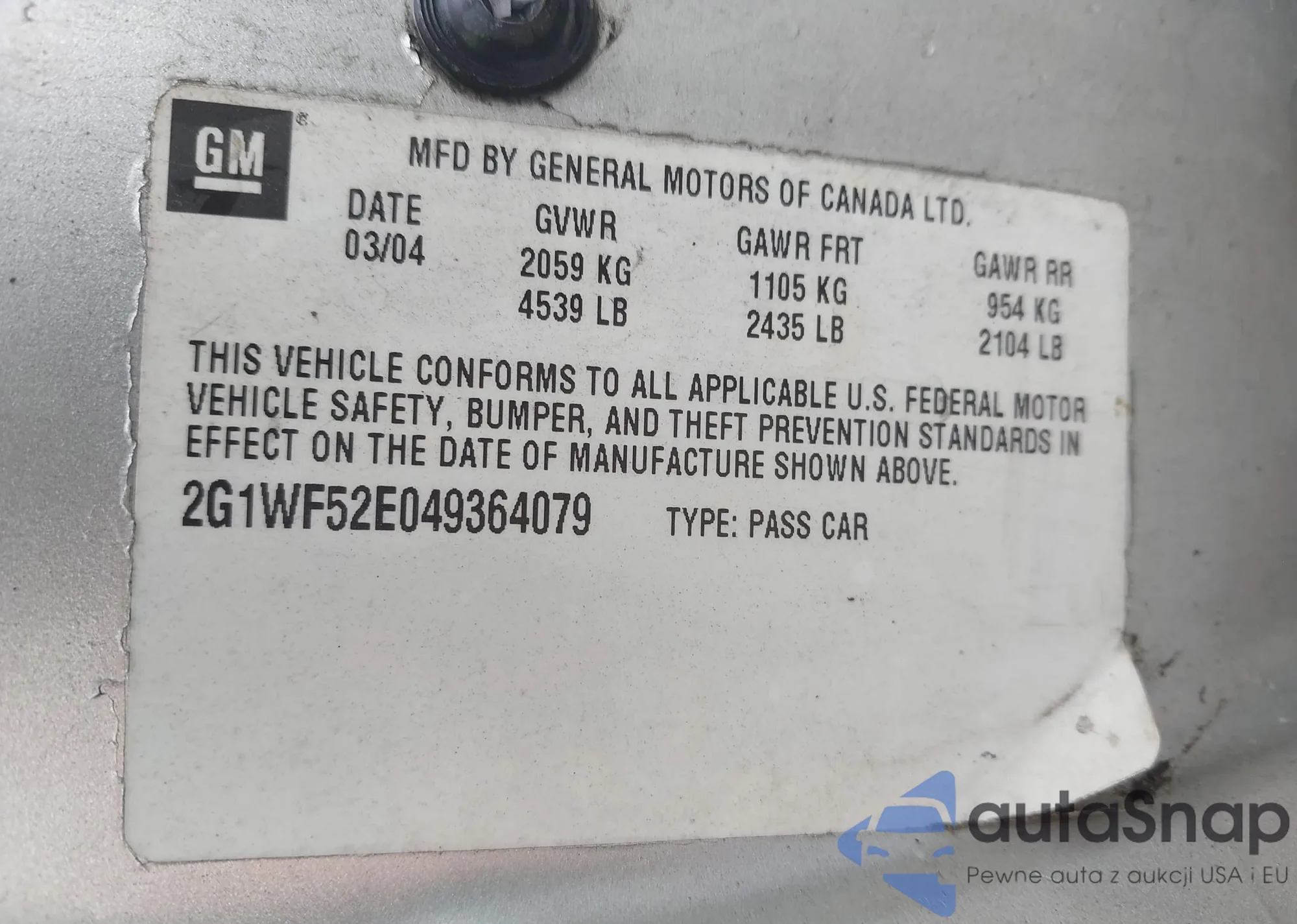 LOT: 42476148 VIN: 2G1WF52E049364079