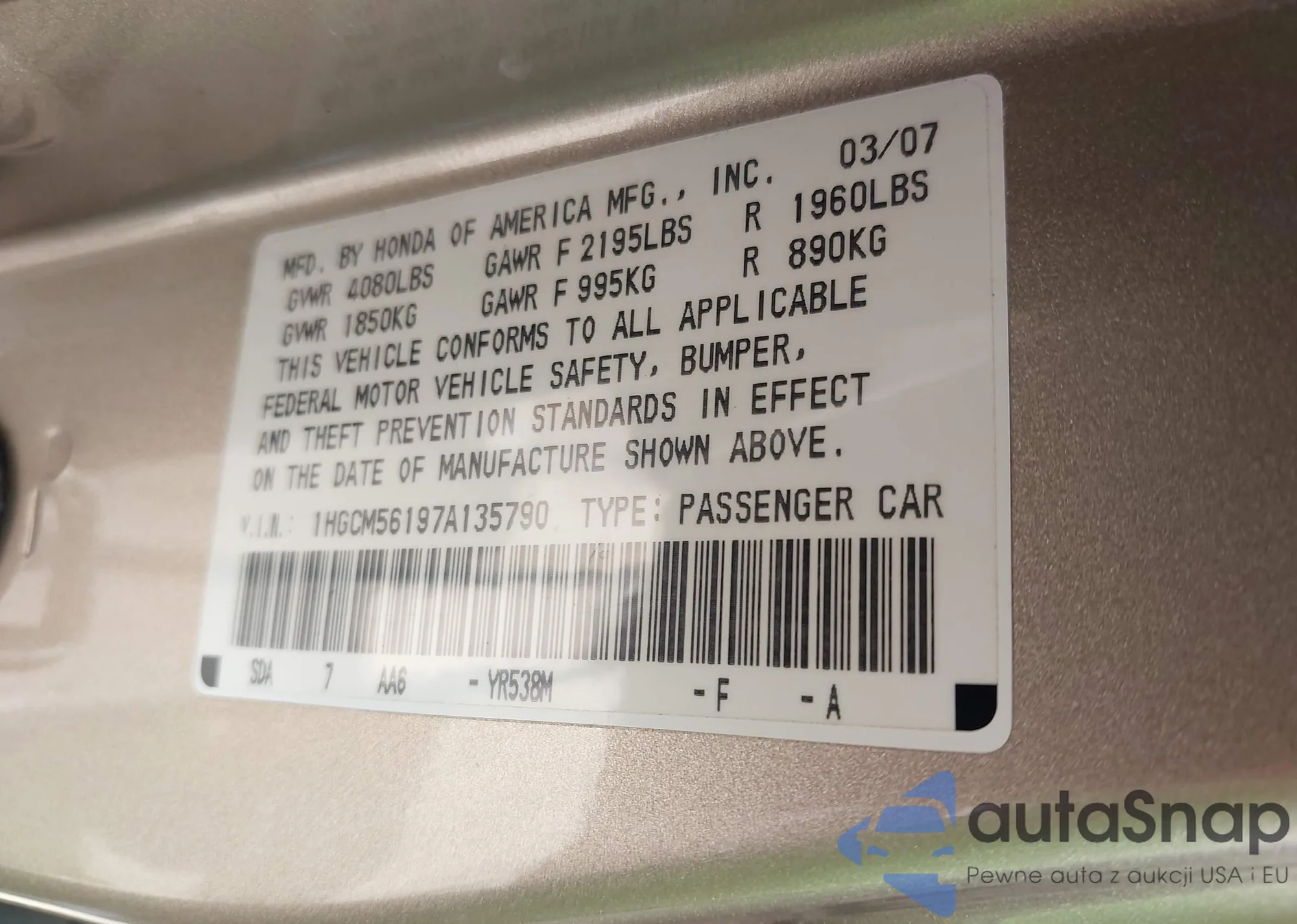 LOT: 42607752 VIN: 1HGCM56197A135790