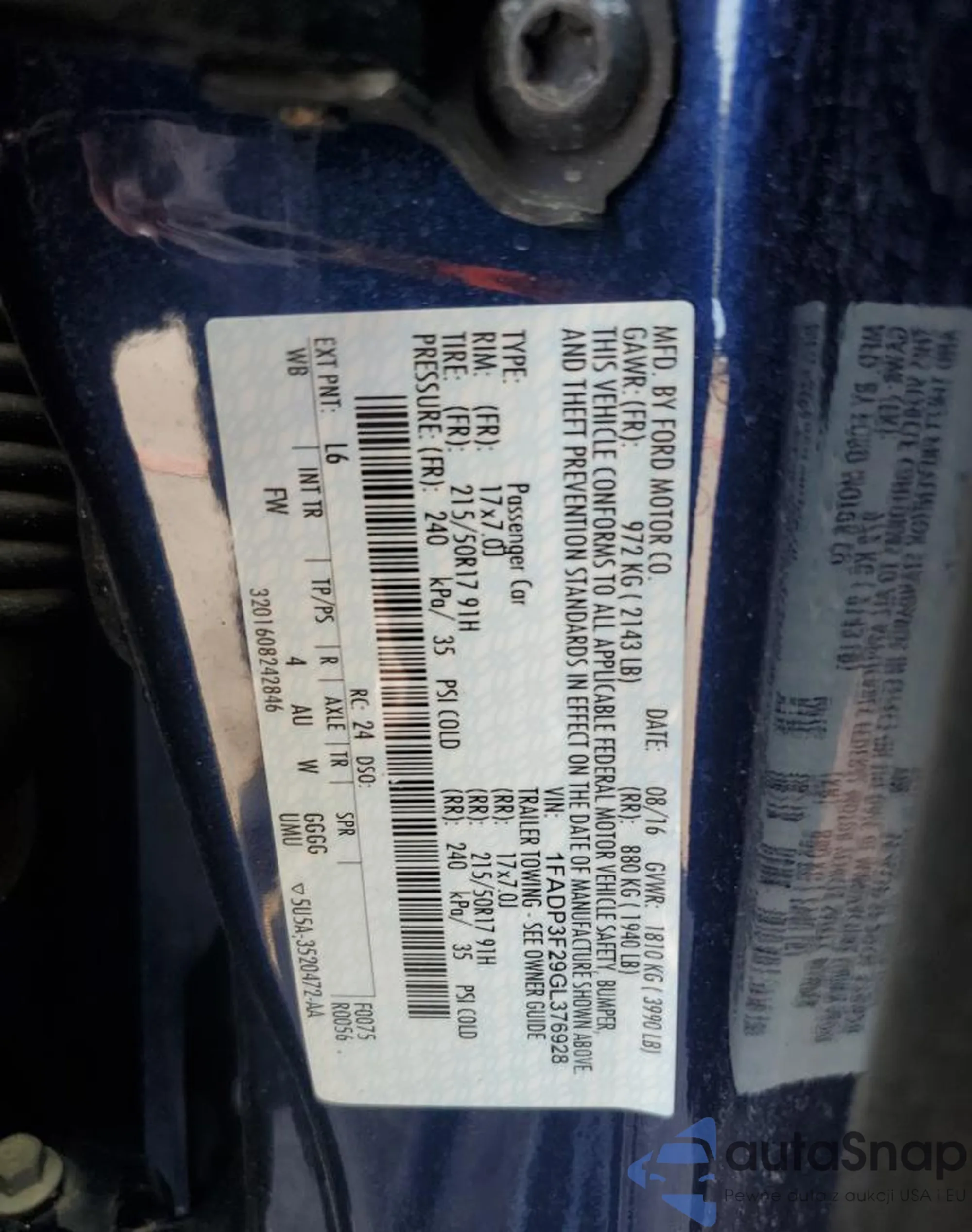 LOT: 62408315 VIN: 1FADP3F29GL376928