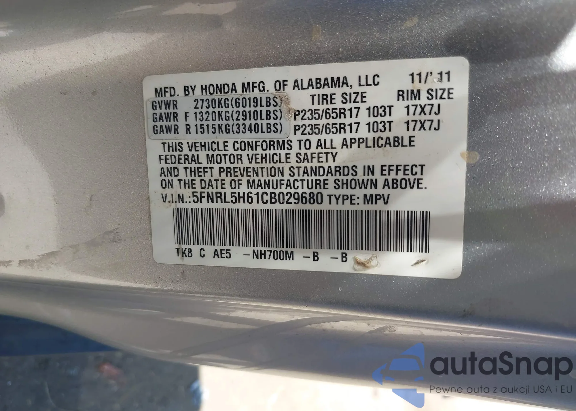 • VIN 5FNRL5H61CB029680