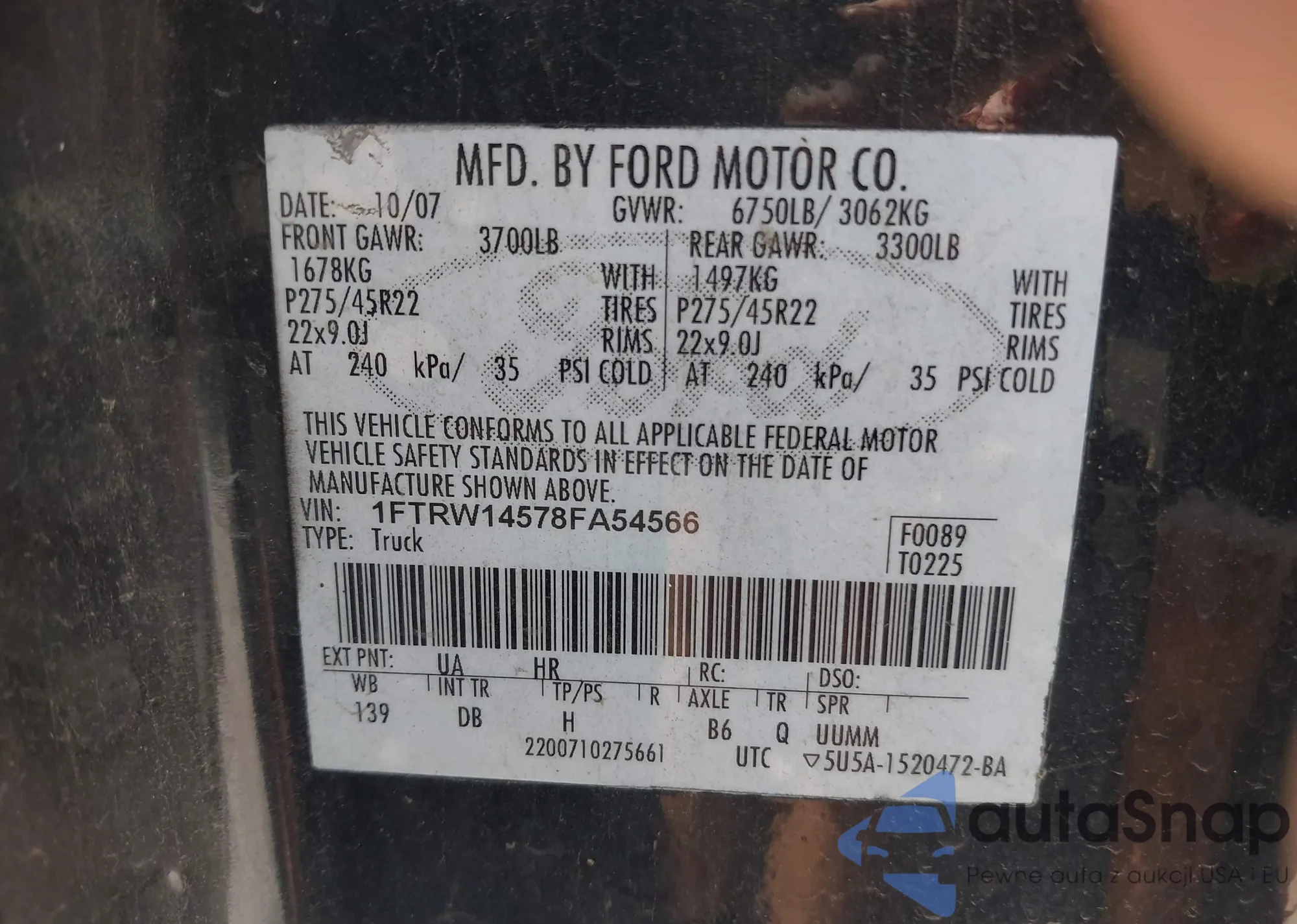 LOT: 42644244 VIN: 1FTRW14578FA54566