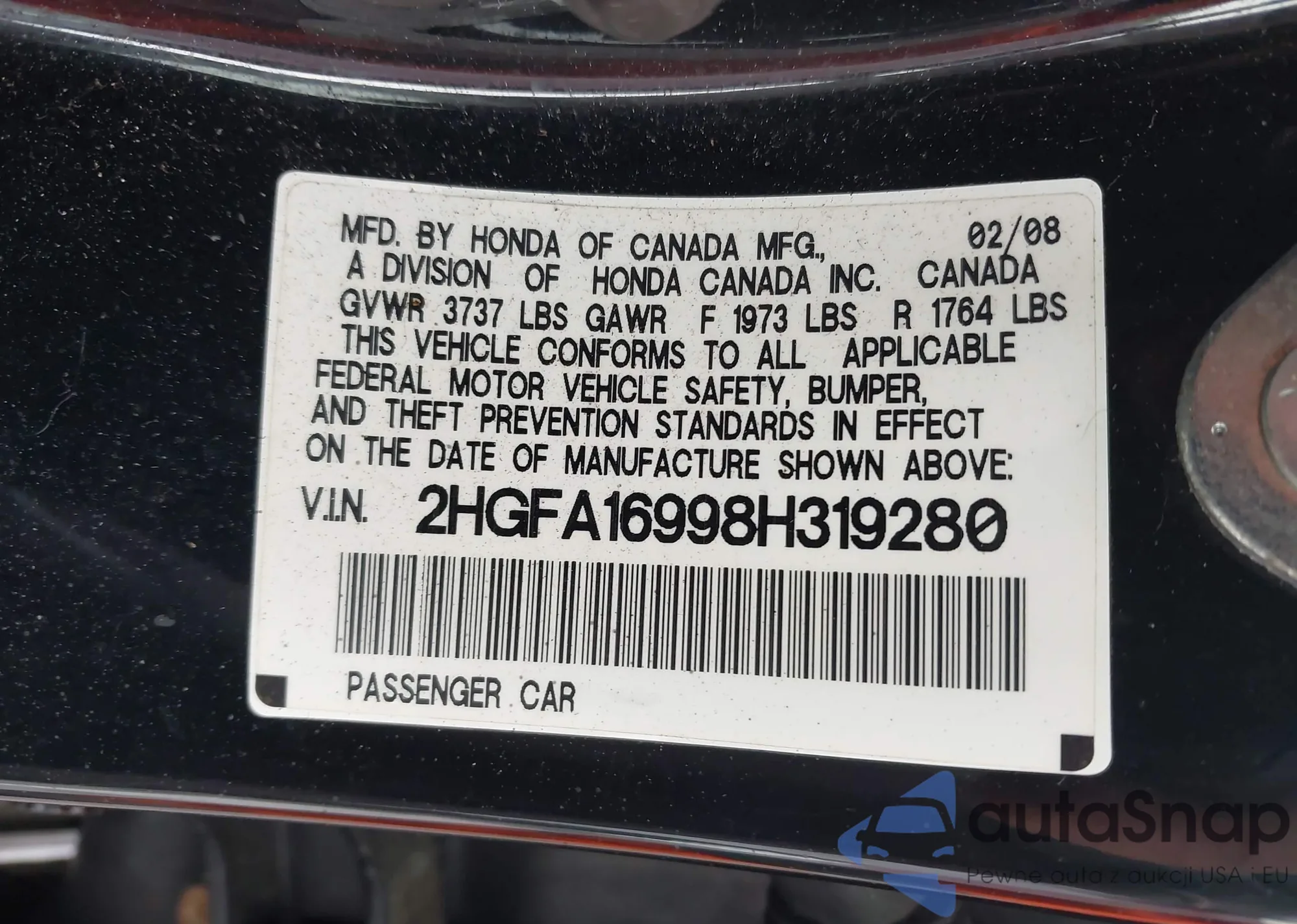 LOT: 42346980 VIN: 2HGFA16998H319280