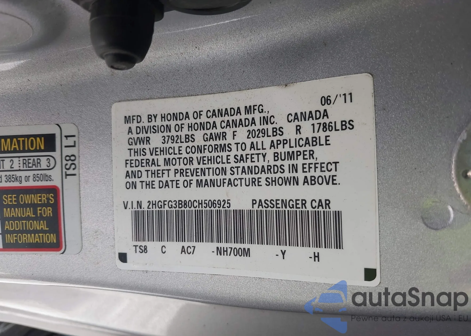 • VIN 2HGFG3B80CH506925