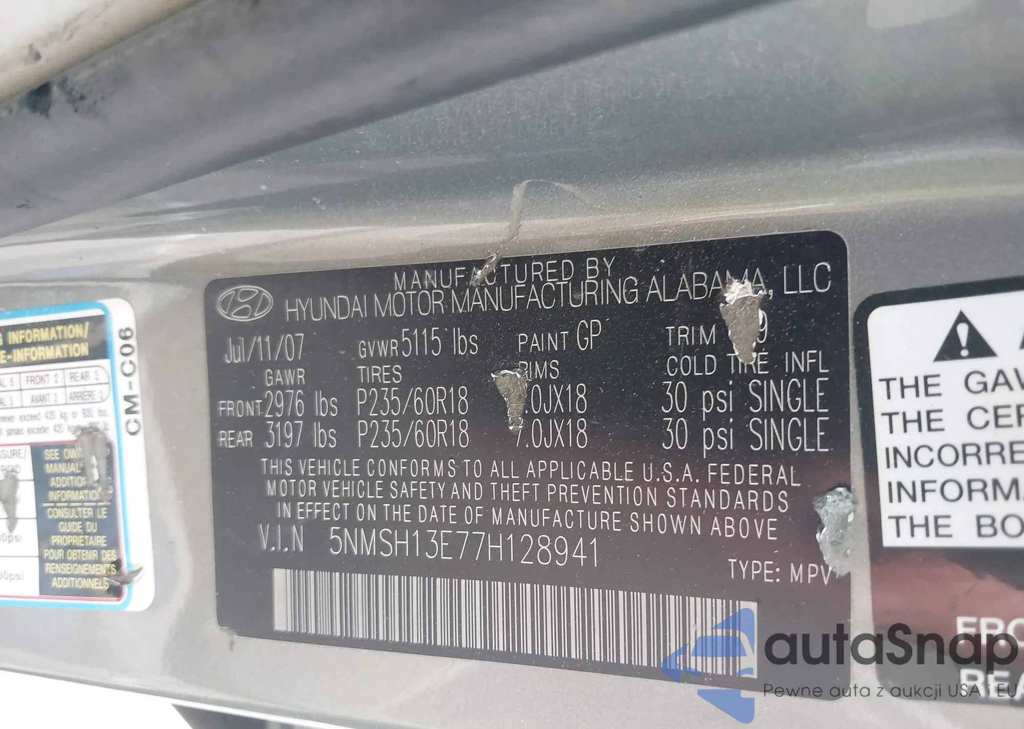 • VIN 5NMSH13E77H128941