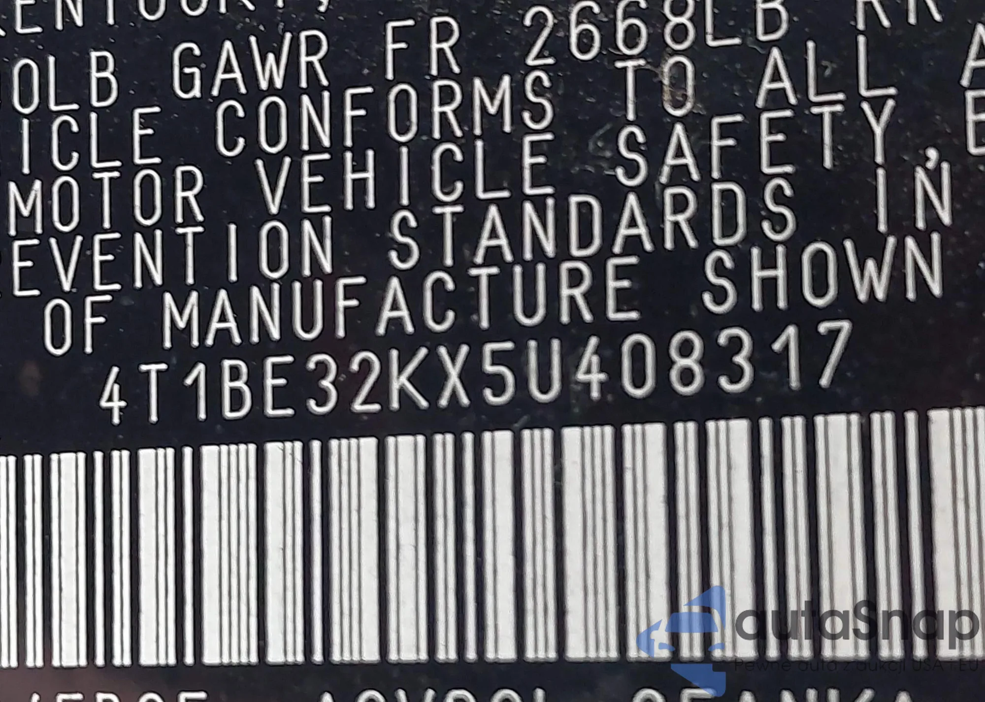 • VIN 4T1BE32KX5U408317