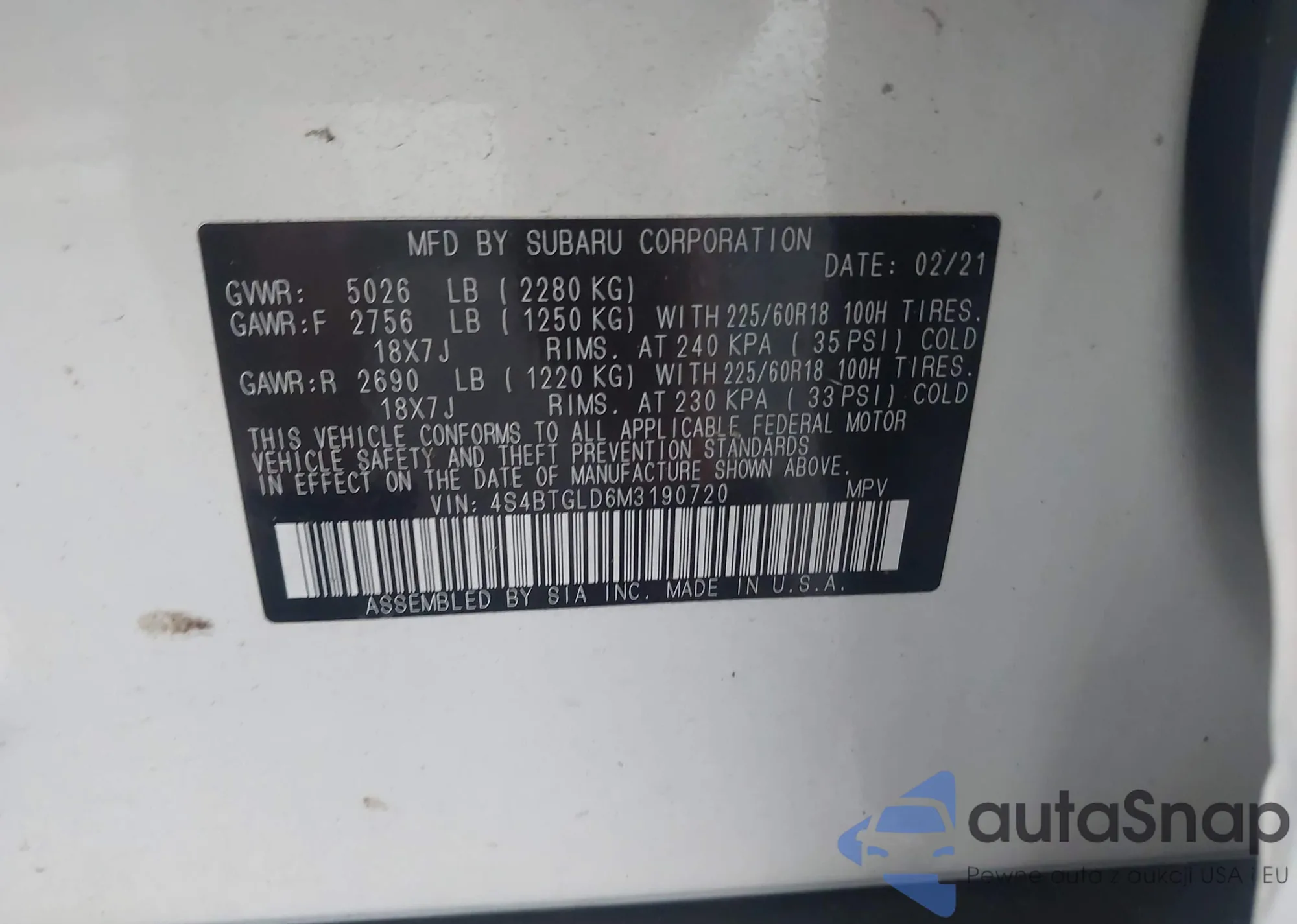 LOT: 42549748 VIN: 4S4BTGLD6M3190720