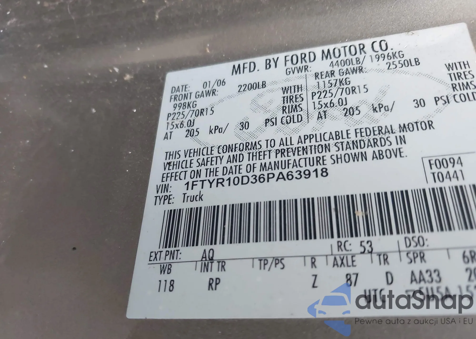 LOT: 42680452 VIN: 1FTYR10D36PA63918