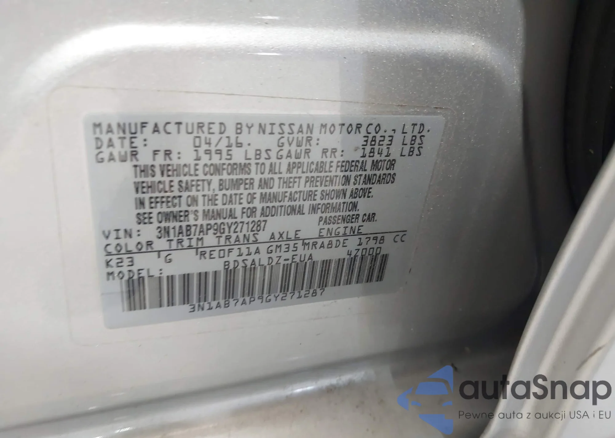 LOT: 42703285 VIN: 3N1AB7AP9GY271287