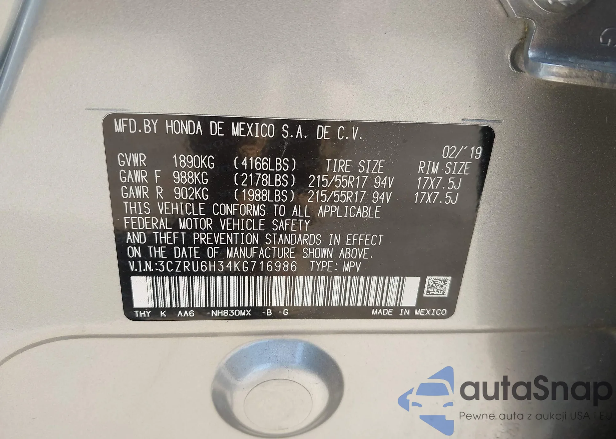 • VIN 3CZRU6H34KG716986