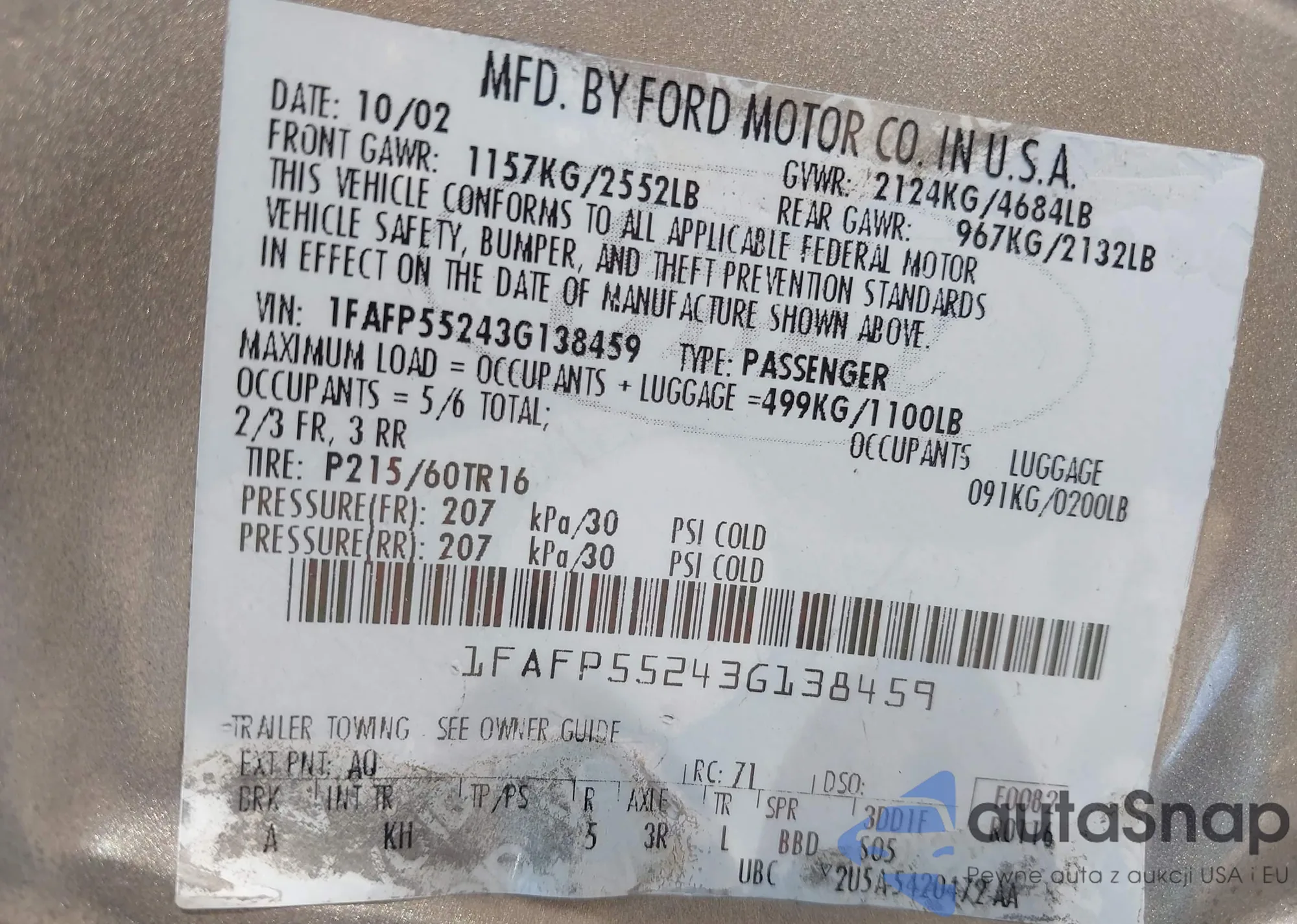 LOT: 40872353 VIN: 1FAFP55243G138459