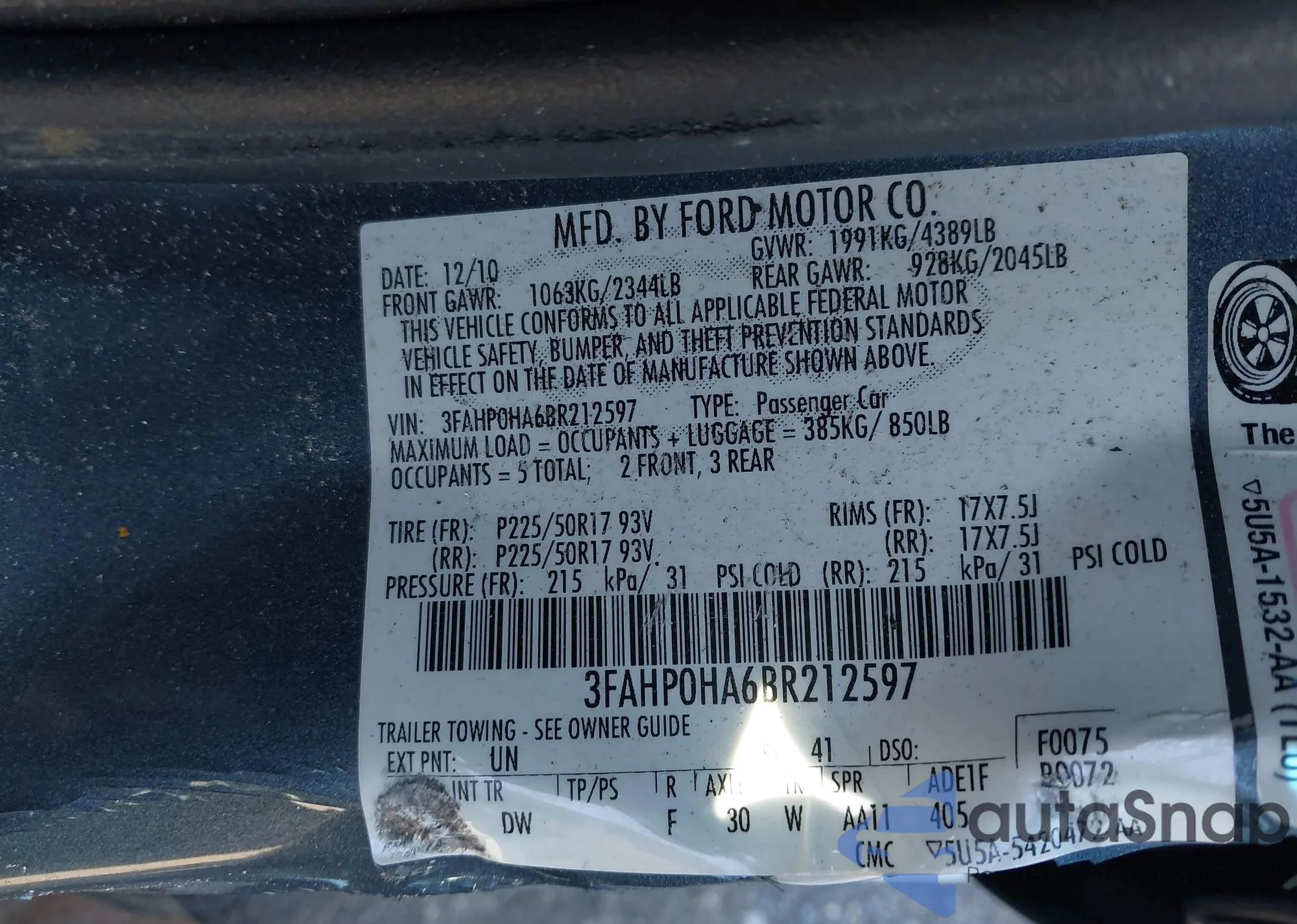 • VIN 3FAHP0HA6BR212597
