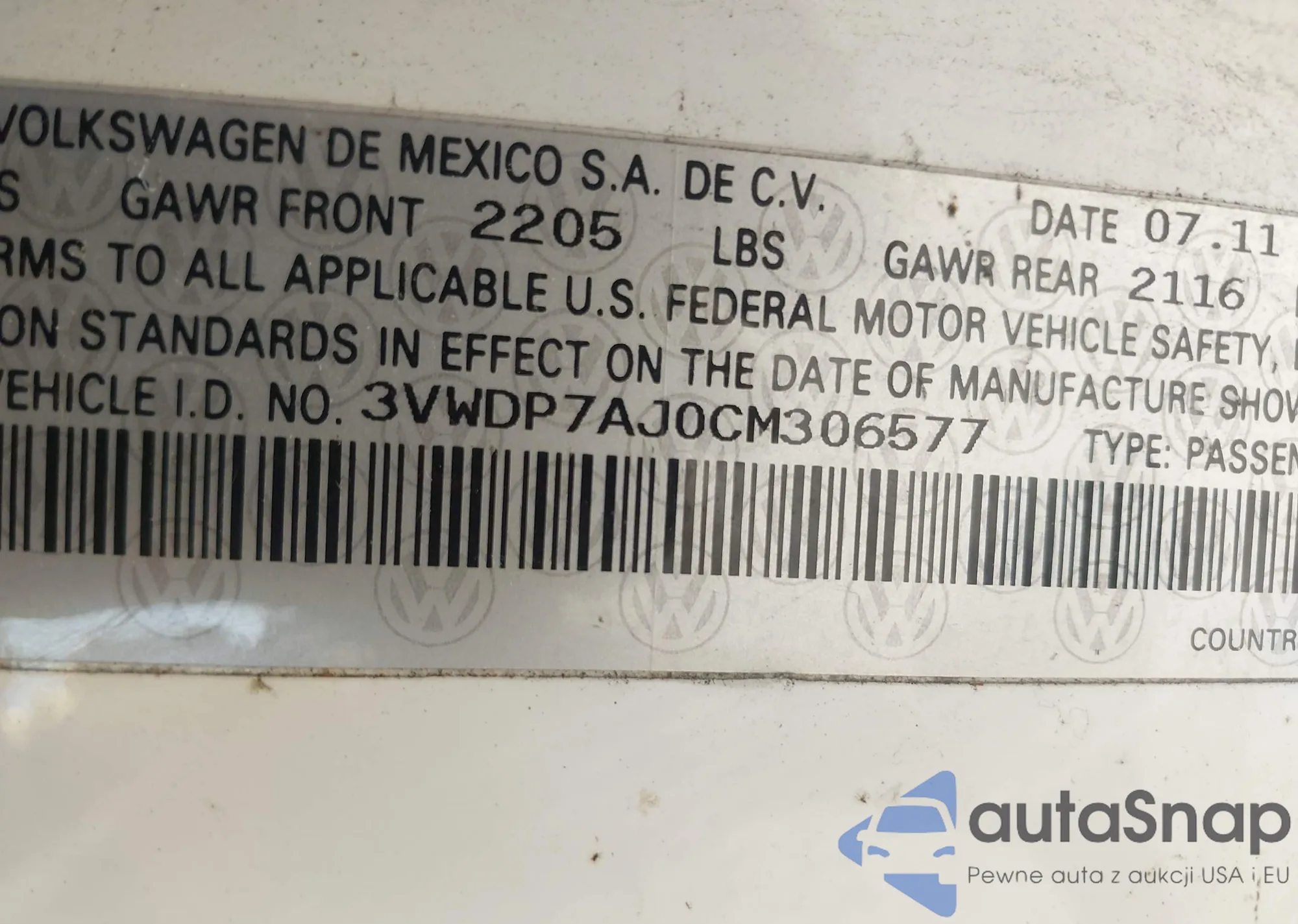 • VIN 3VWDP7AJ0CM306577