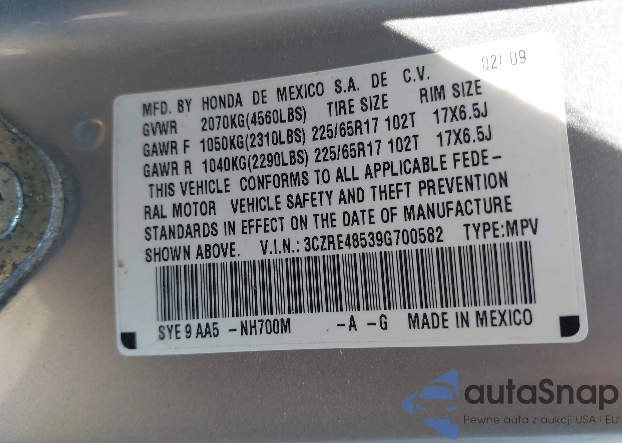 • VIN 3CZRE48539G700582