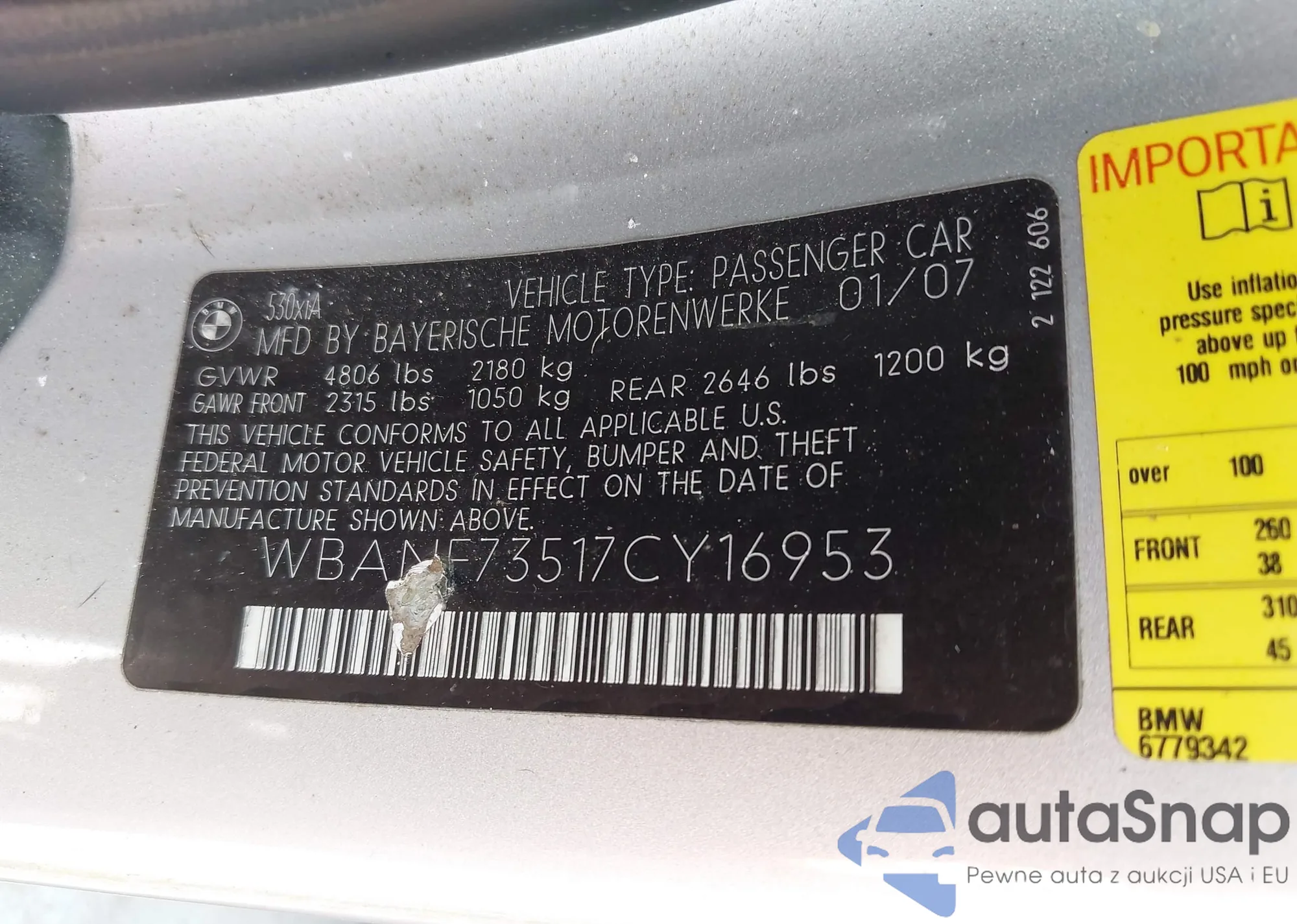 2007 BMW 530Xi z USA, uszkodzony, nr VIN WBANF73517CY16953
