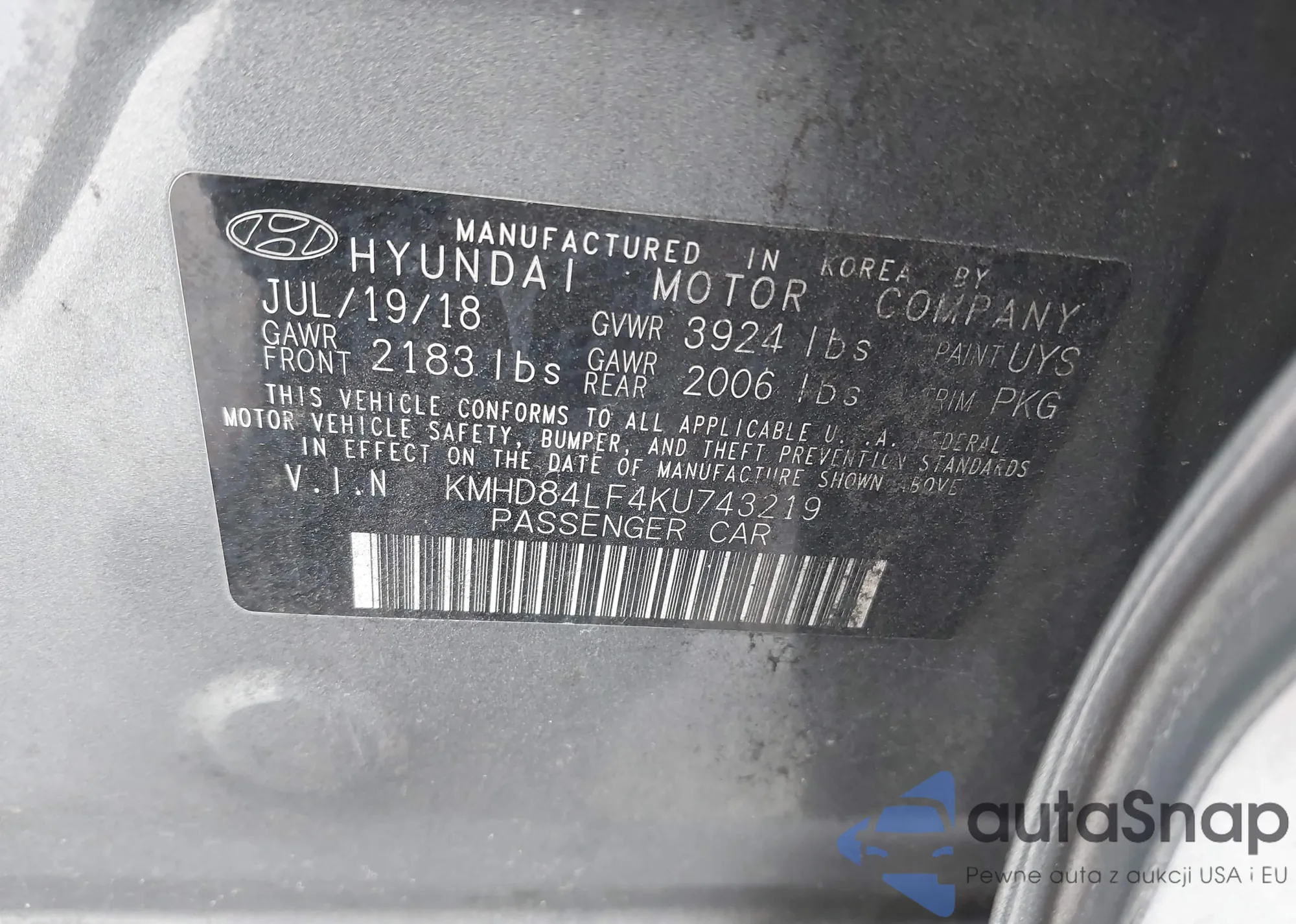 LOT: 41207476 VIN: KMHD84LF4KU743219