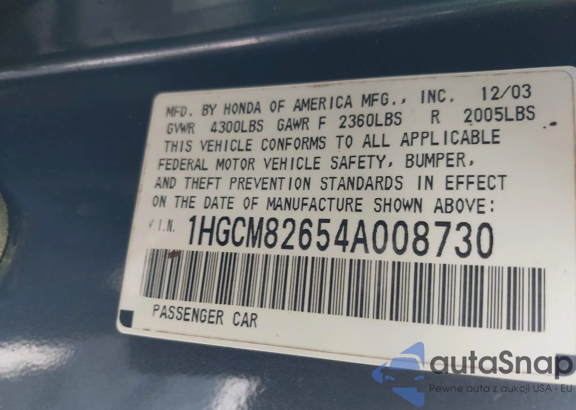LOT: 42479614 VIN: 1HGCM82654A008730