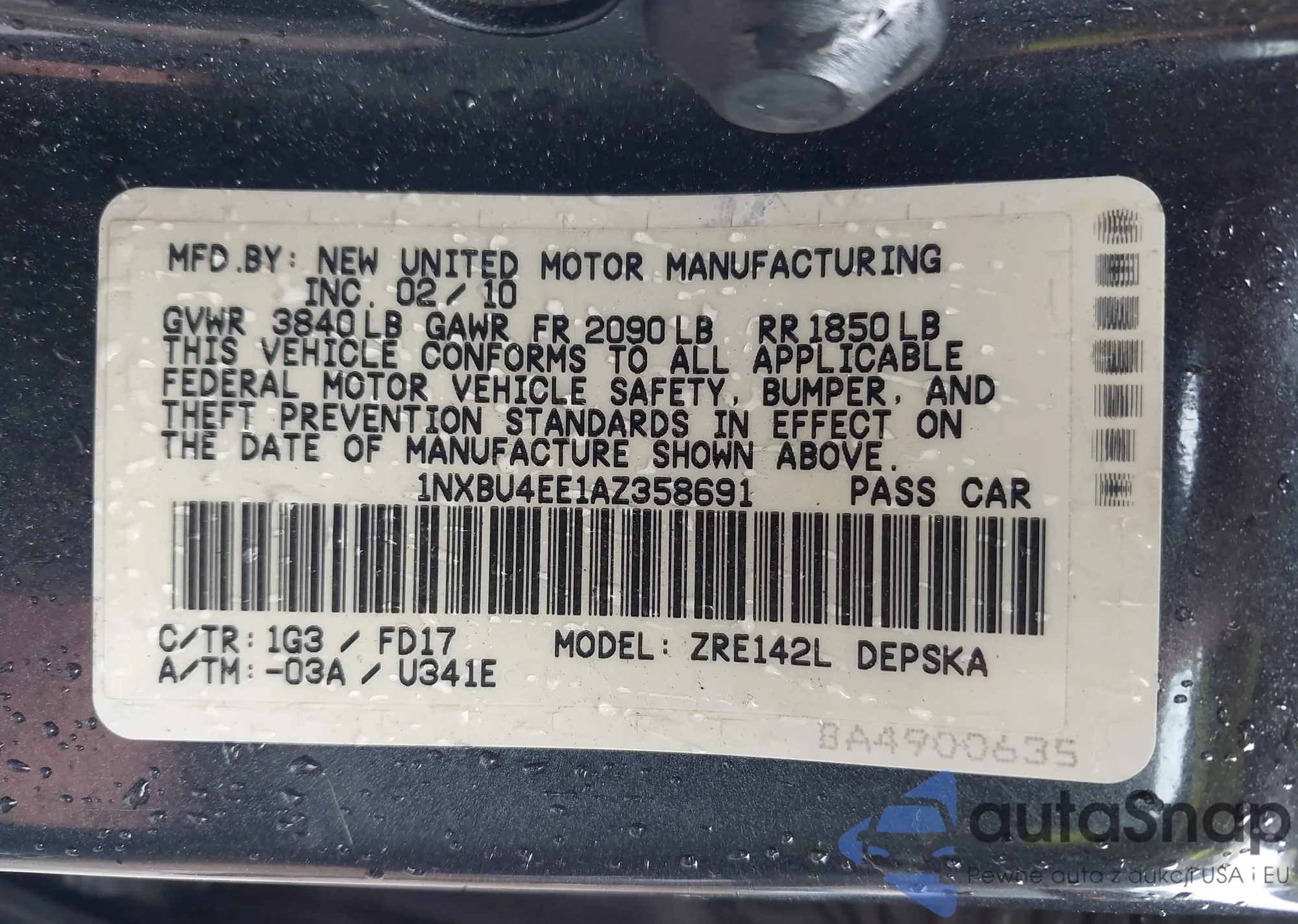 • VIN 1NXBU4EE1AZ358691
