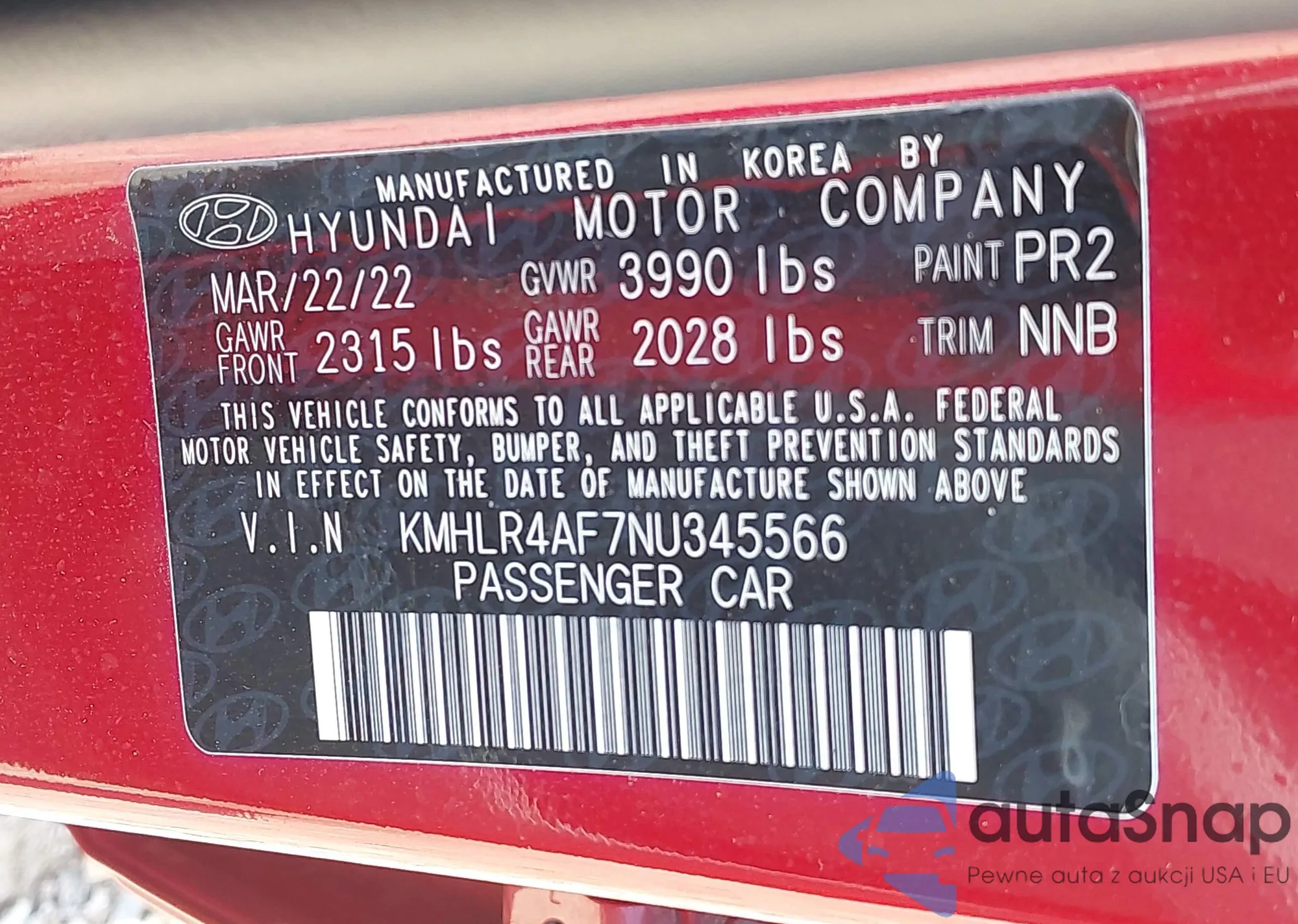 • VIN 5J6RW2H57NA009405