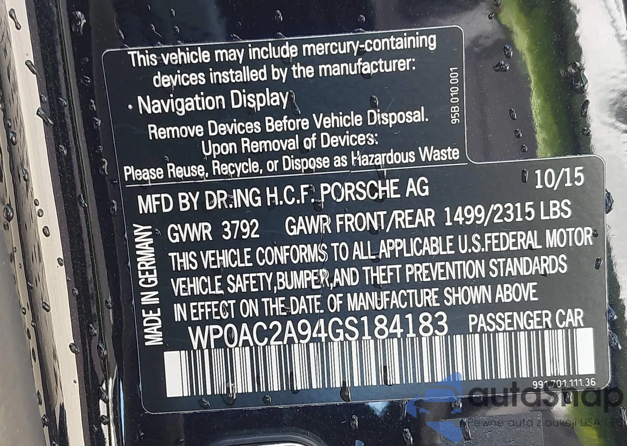LOT: 42545612 VIN: WP0AC2A94GS184183