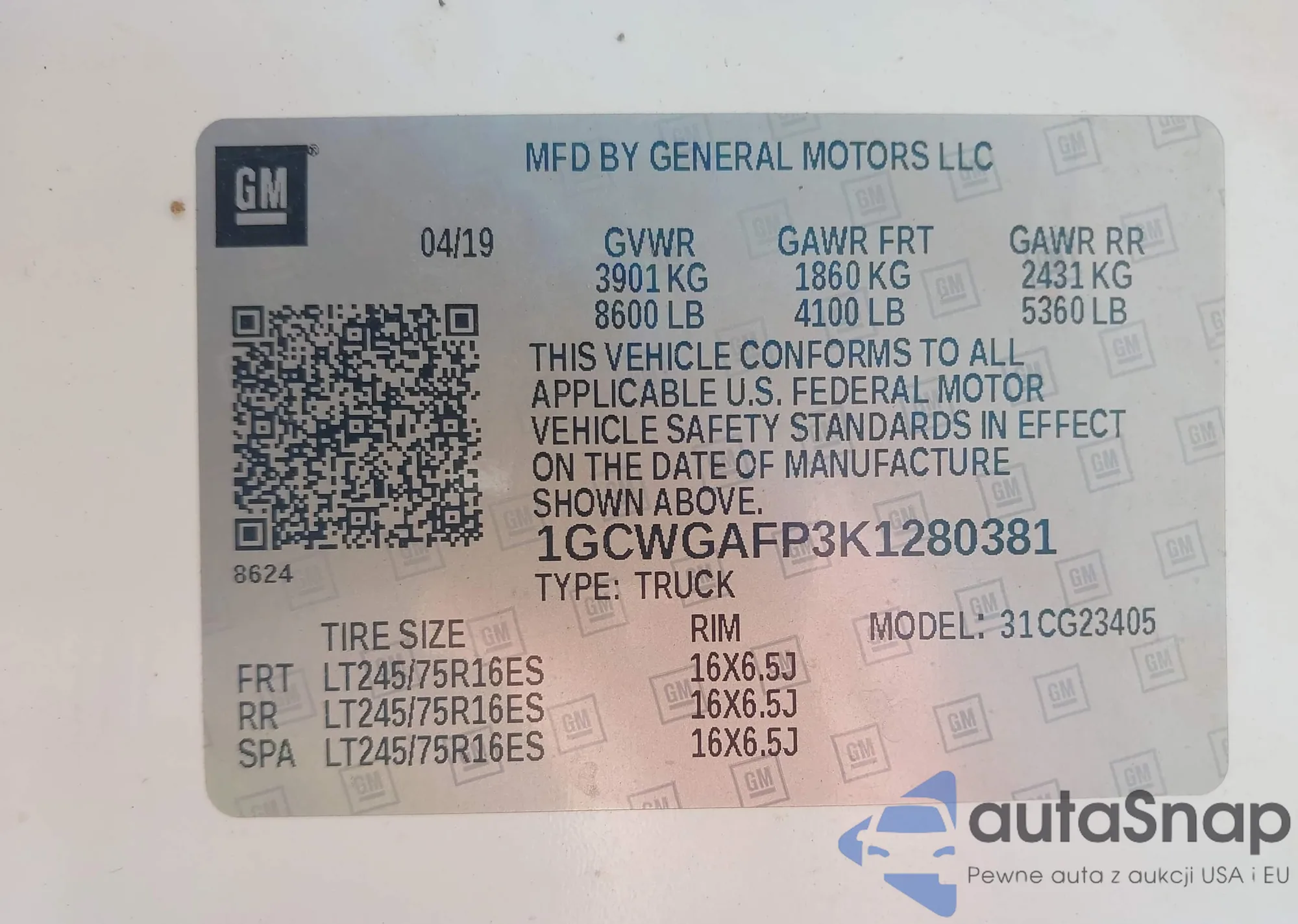 LOT: 42710535 VIN: 1GCWGAFP3K1280381