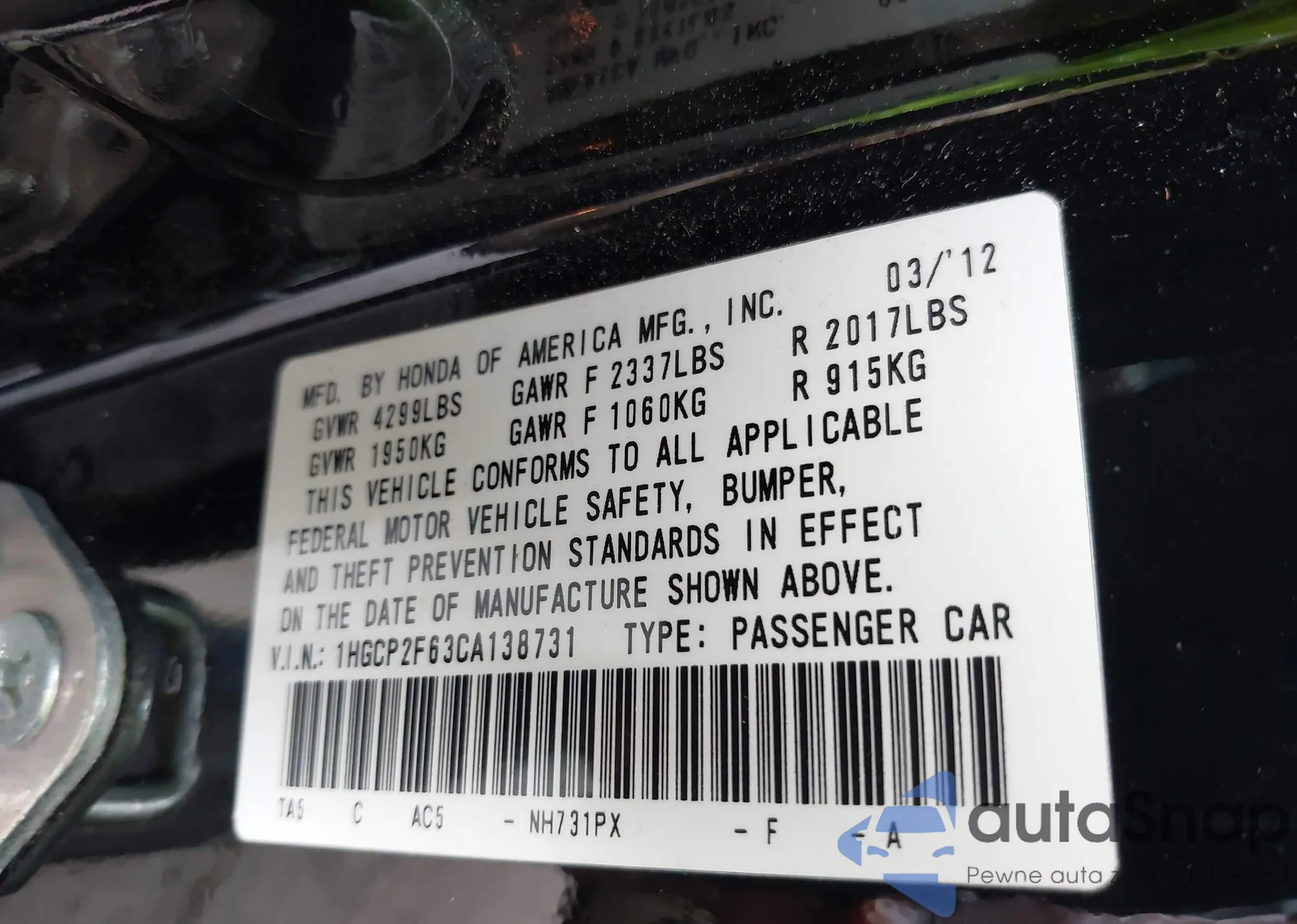 LOT: 42710634 VIN: 1HGCP2F63CA138731