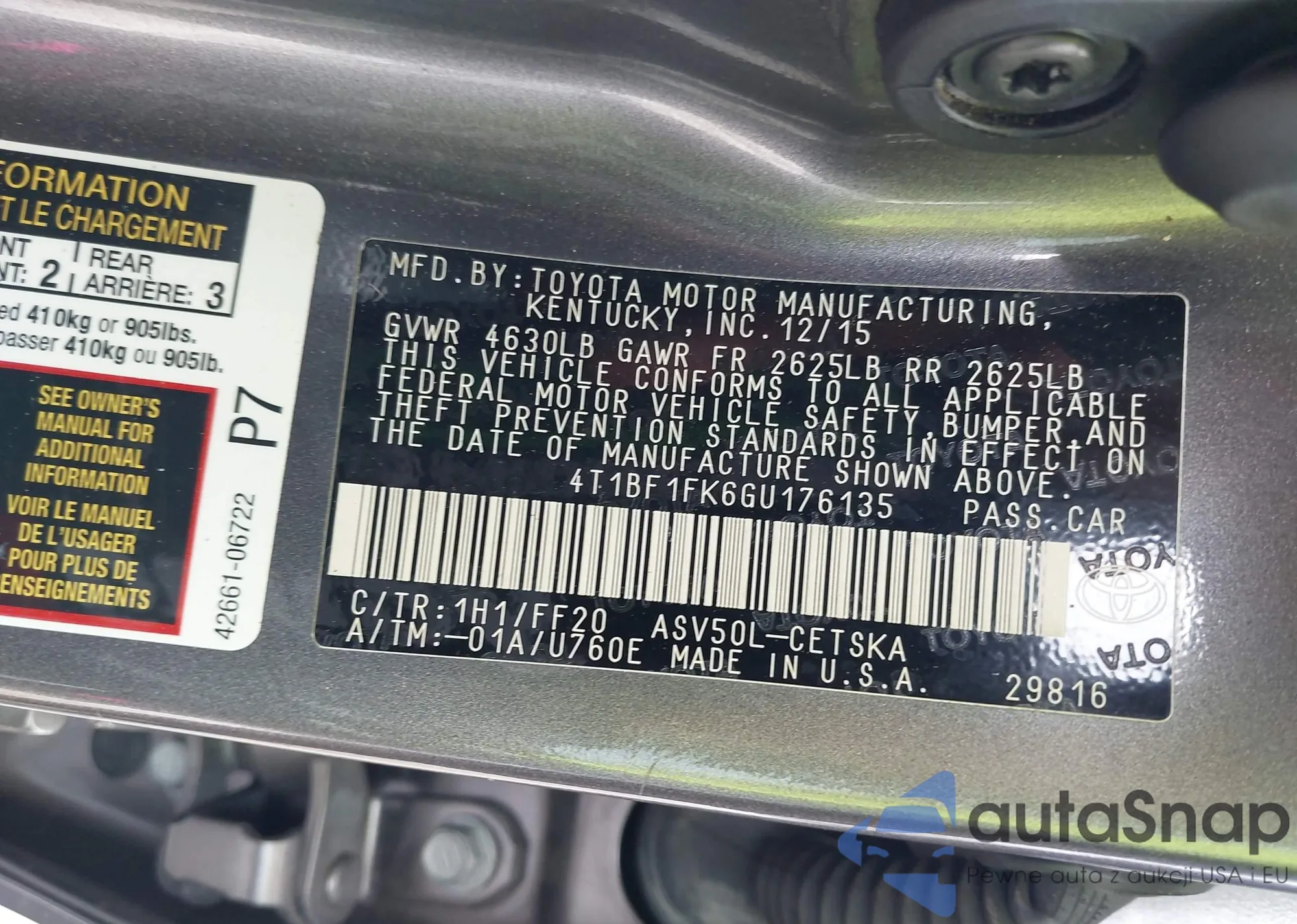 LOT: 42487340 VIN: 4T1BF1FK6GU176135