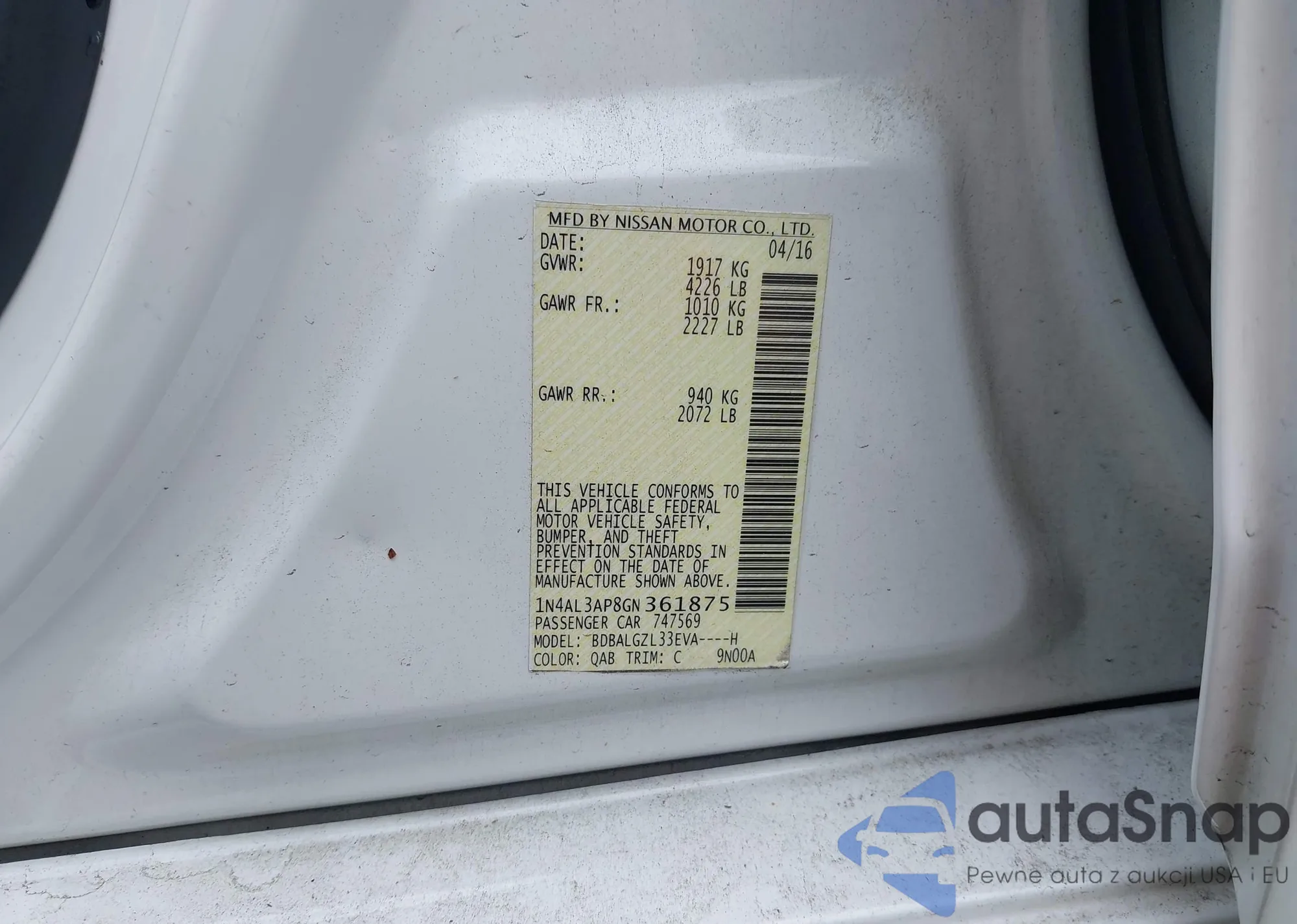 • VIN 1N4AL3AP8GN361875