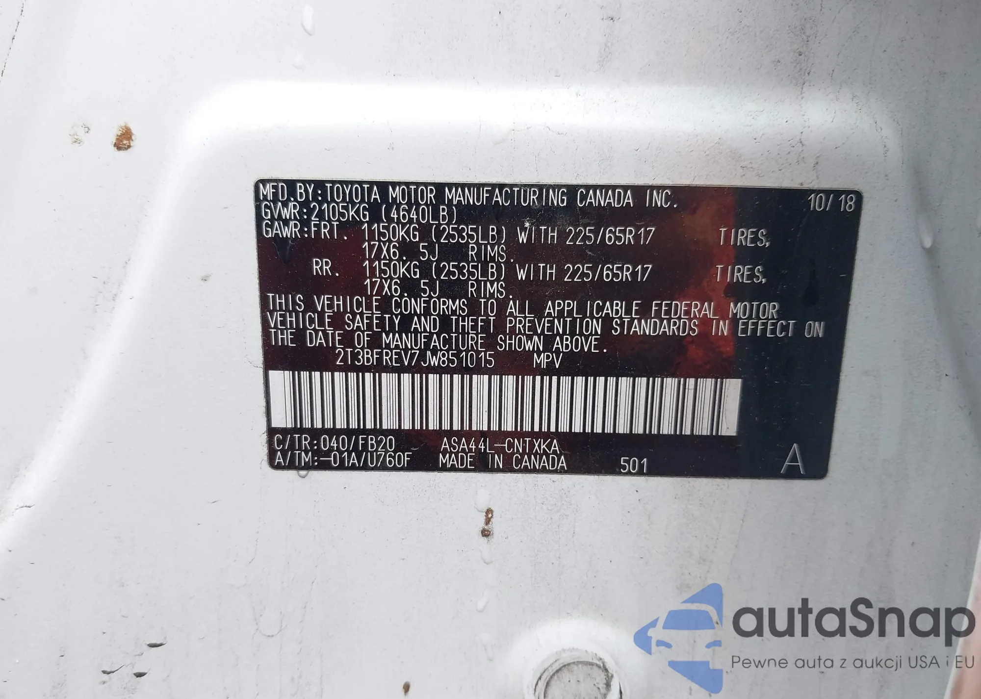 • VIN 2T3BFREV7JW851015