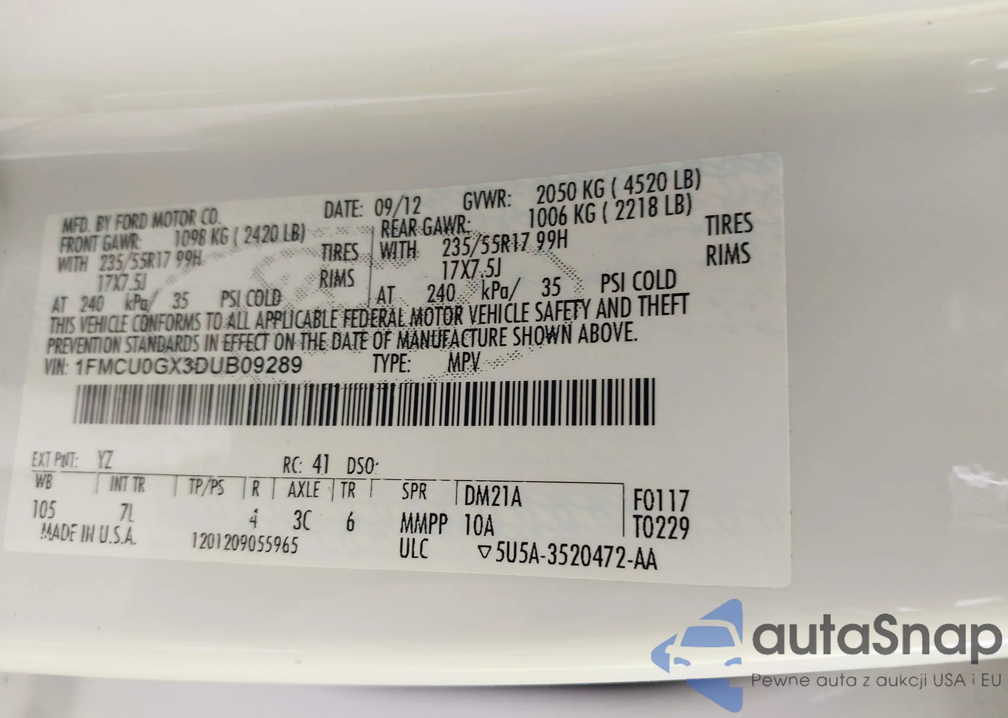 LOT: 42576472 VIN: 1FMCU0GX3DUB09289