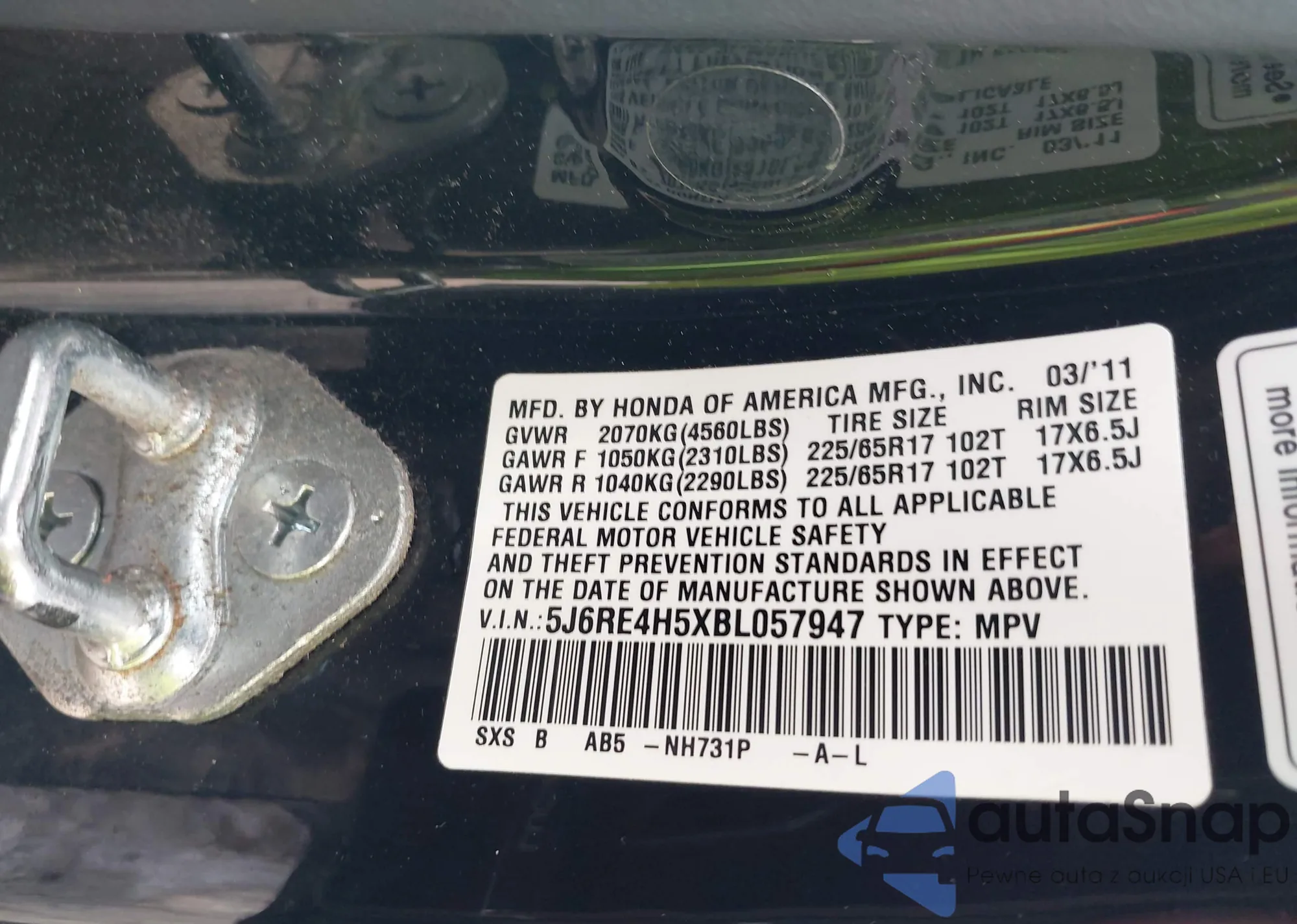 • VIN 5J6RE4H5XBL057947