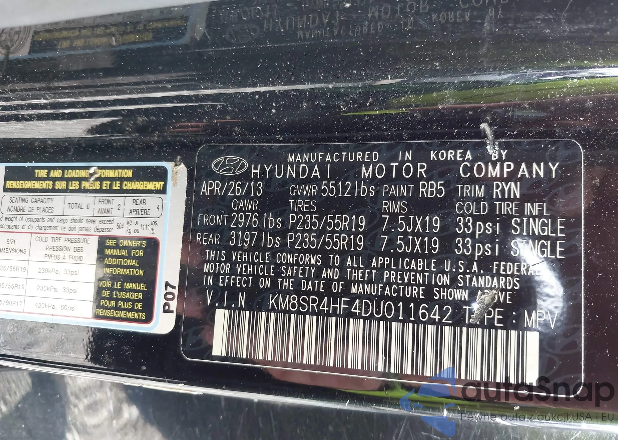 LOT: 42514214 VIN: KM8SR4HF4DU011642